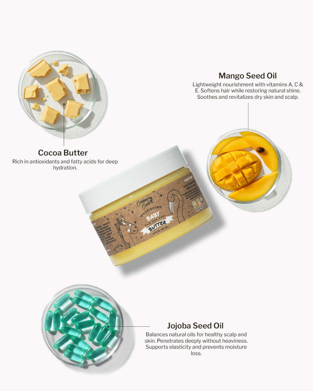 Our non-whipped and highly concentrated hair and body butter provides amazing softness, manageability and shine for kinks, coils and curls. This creamy butter also acts as a sealant to lock in moisture and reduce breakage. For the body, it helps to moisturize, soften and heal dry/cracked skin. A great product for the entire family.