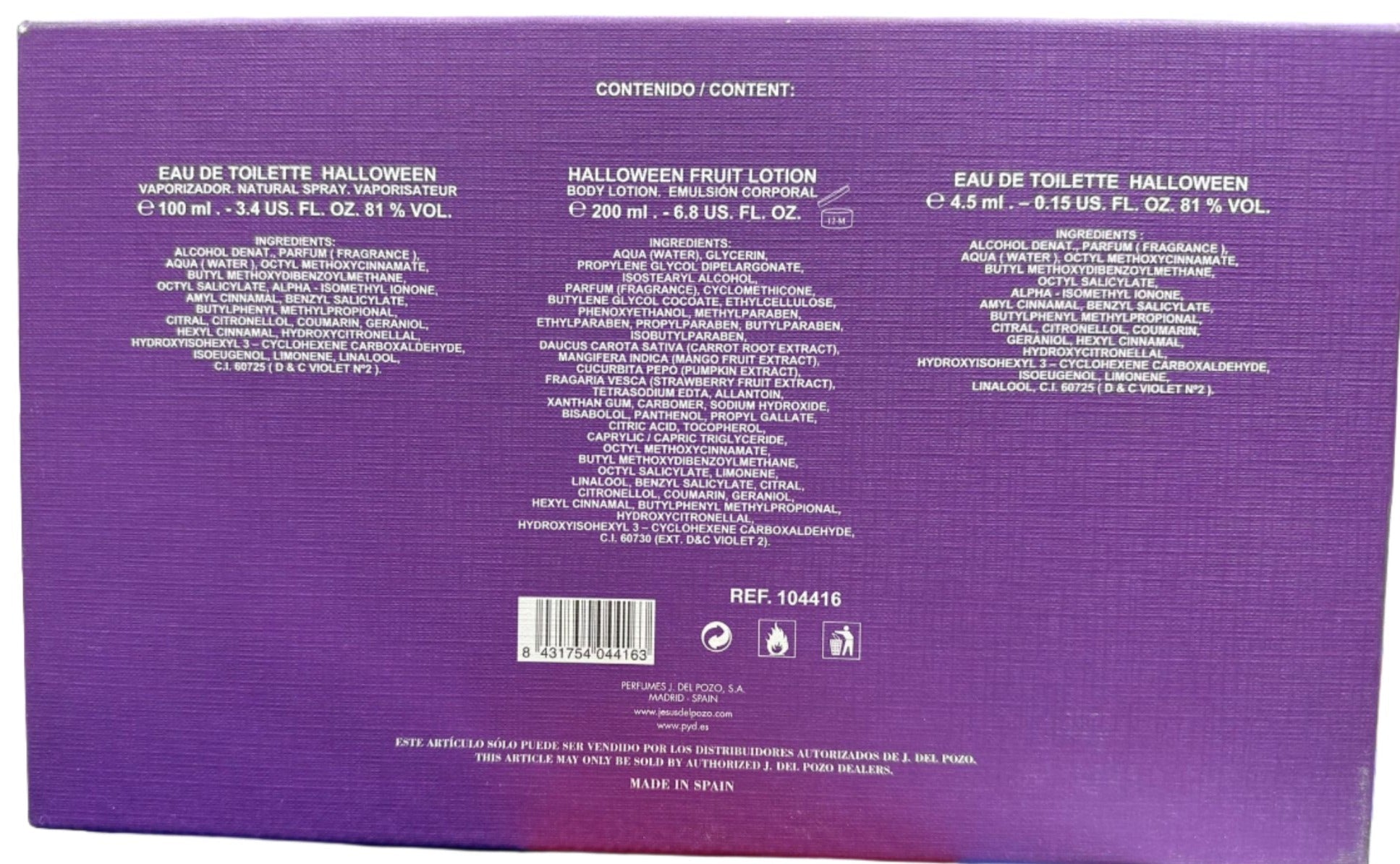 The Halloween 3-piece gift set includes a 3.4 oz Eau de Toilette (EDT) spray, a 6.8 oz fruit lotion, and a 0.15 oz mini EDT spray. This set offers a complete and delightful fragrance experience with different application options.