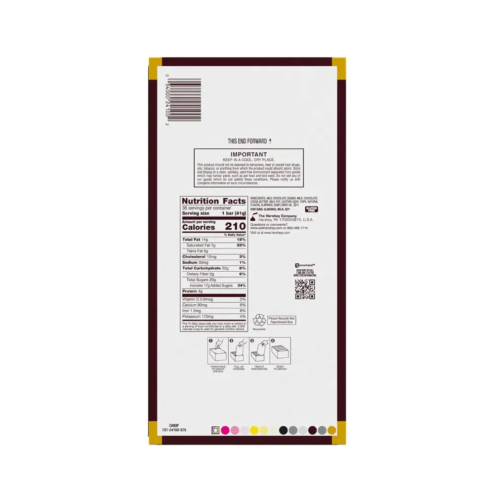 - Case of 36 units: Case contains 36 individual units of Hershey's Milk Chocolate with Almonds, suitable for bulk purchases.