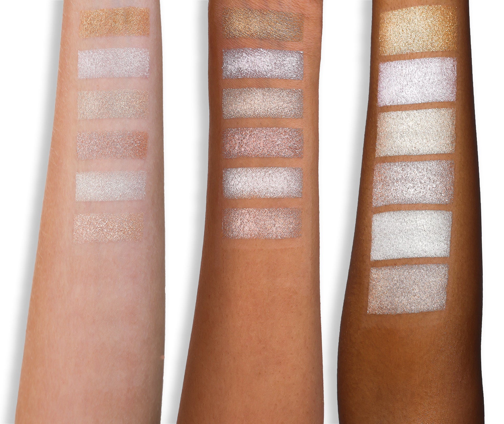 Application: These highlighters can be applied to the face and all over the body. They can be used dry or wet (for a more intense glow). Apply product to the high points of the face, such as the top of the cheeks, forehead, tip and bridge of the nose, cupid’s bow, chin, inner corners of the eyes, and even the brow bone. Showing more skin? Apply highlighter to the shoulders, collar bones, the chest, and anywhere else you’d like your skin to gleam.