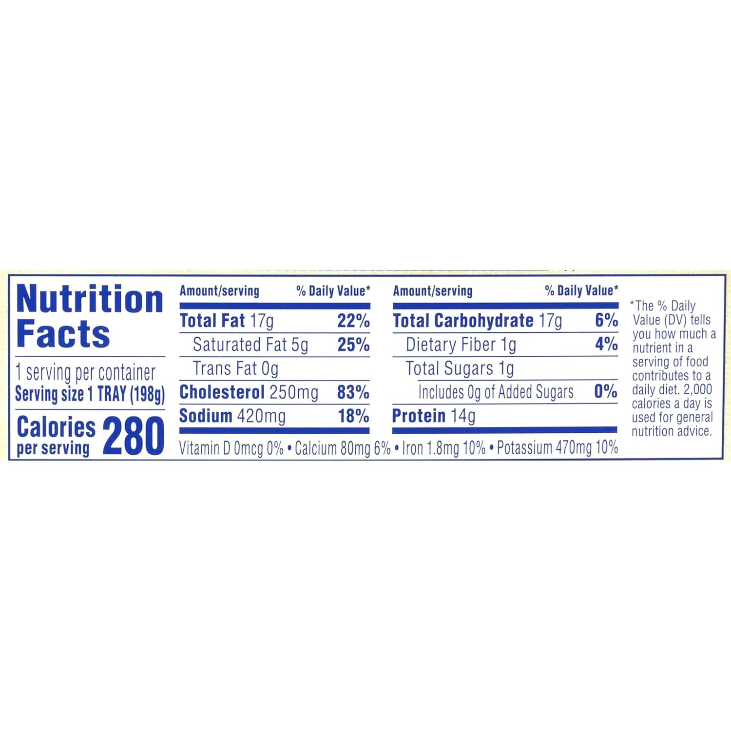 Ingredients: Water, Eggs (Whole Eggs, Corn Starch, Citric Acid Added to Preserve Color), Rehydrated Potatoes (Water, Dehydrated Potatoes, Mono-and Diglycerides, Sodium Acid Pyrophosphate, Citric Acid), Pasteurized Process American Cheese (American Cheese [Milk, Salt, Cheese Cultures, Enzymes], Water, Sodium Phosphate, Cream, Salt, Lactic Acid), Corn Oil, Cooked Bacon (Cured With Water, Salt, Sugar, Sodium Erythorbate, Sodium Nitrite. May also contain Smoke Flavoring, Dextrose, Sodium Phosphate, Potassium Chloride, Sodium Diacetate, Flavoring, Honey), Isolated Soy Protein, Modified Cornstarch, Potassium Chloride, Citric Acid, Spice, Disodium Inosinate and Disodium Guanylate, Turmeric, Cream of Tartar. Contains: Milk, Egg, Soy.