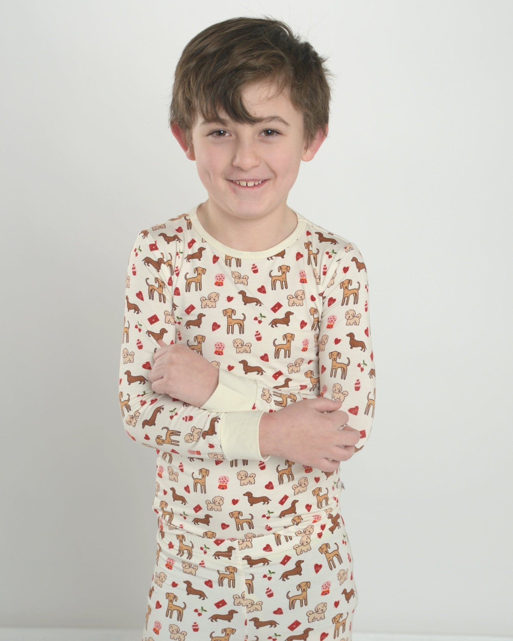 Snuggle up and spread some love with our I Ruff You Kids Bamboo Pajamas! Featuring a Valentine's Day print with cute puppies and nostalgic holiday goodies, these two piece sets are perfect for cuddling. Made from bamboo, they're cozy and sustainable. Puppy love never looked so good!