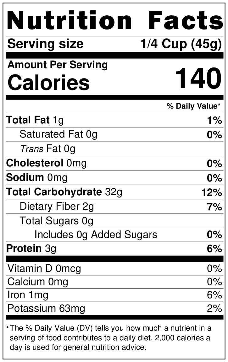 Allergen Statement: Product packed in a facility that also handles nuts, peanuts, soy, sesame, and wheat. 1 lb and 5 lb sizes only.
