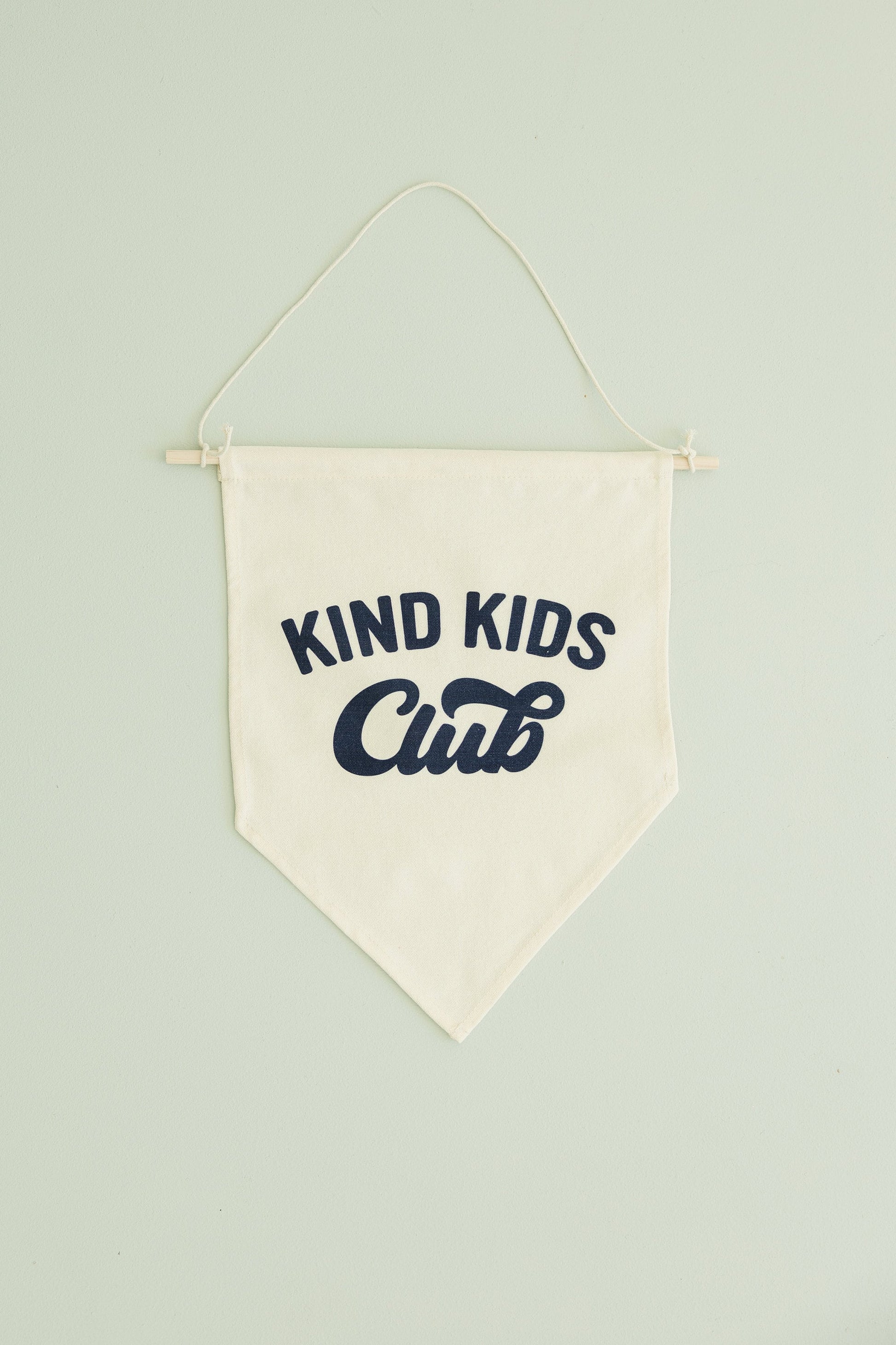 Kind Kids Club natural-colored hanging canvas pennant on a wooden dowel.