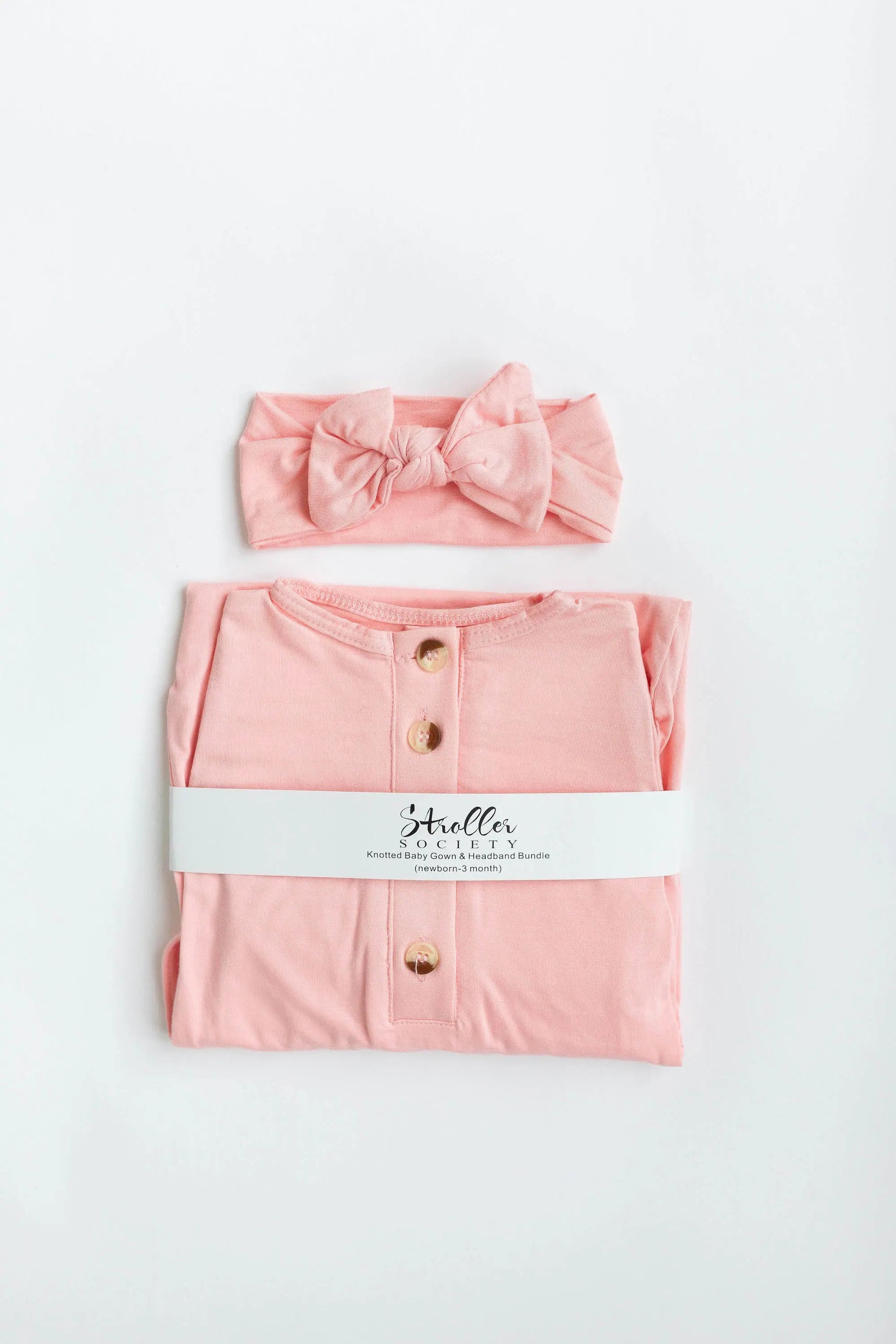Knotted Baby Gown and Hat Set with Headband - Pink (Newborn-3 months)