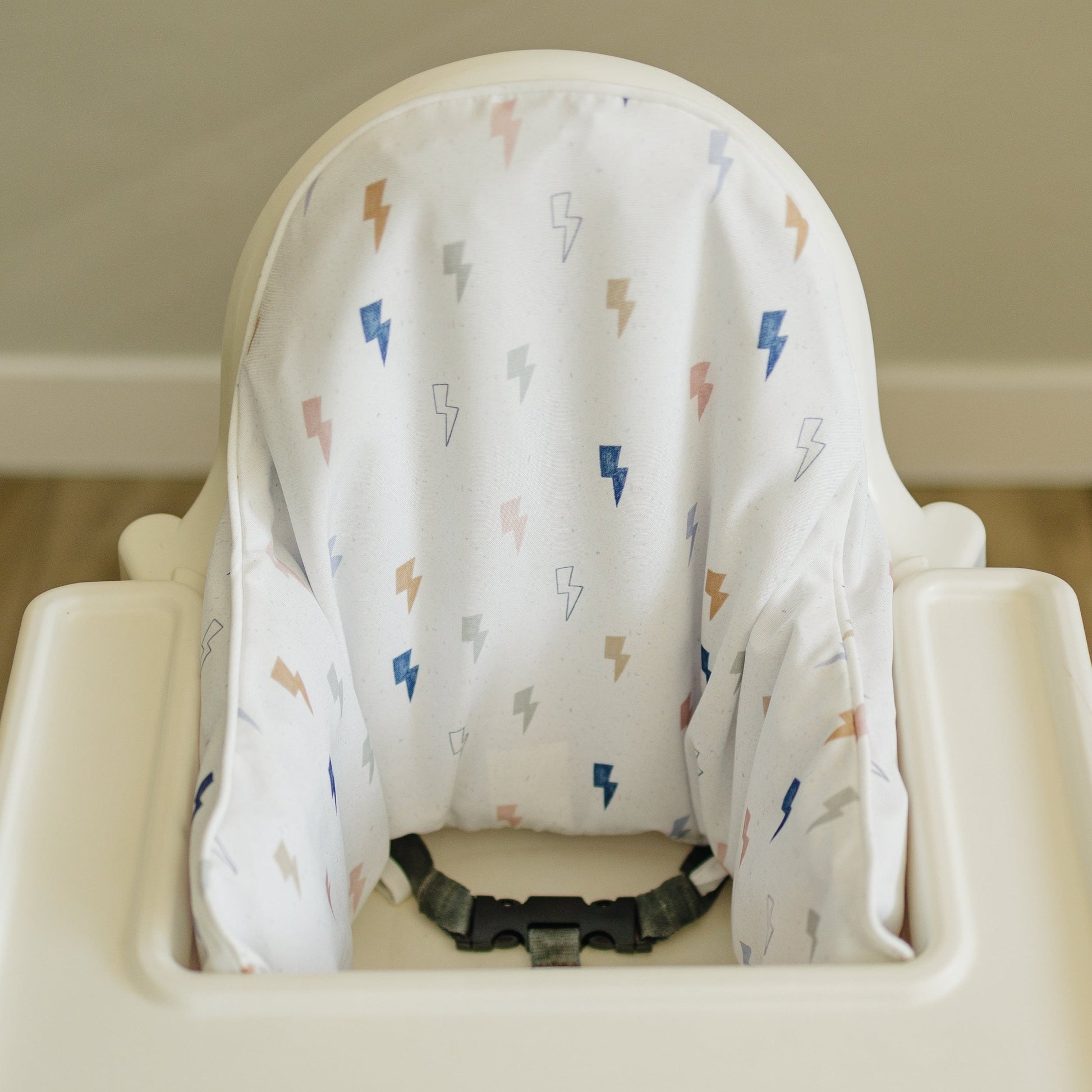 A fun multi color lightning bolt print! Wipeable cushion cover for the IKEA Antilop Highchair