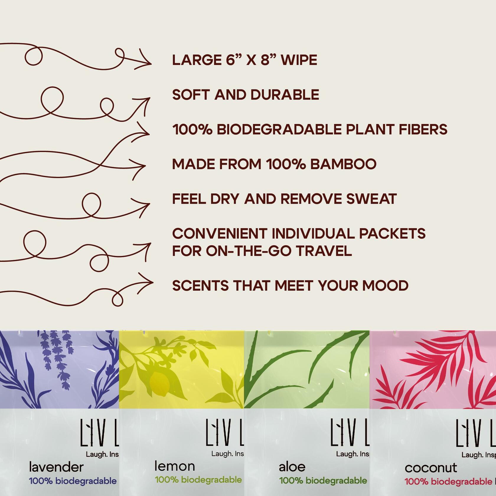 Refresh, revive, and renew with Liv Linen - the all-natural bamboo, aromatherapy deodorant wipes that keep you feeling clean, confident, and uplifted all day long. 100% bamboo, ultra-soft and durable Infused with soothing scents like lemon, lavender, coconut, and aloe Great for sensitive skin Liv Linen wipes are a game-changer for busy, on-the-go lifestyles. Gently cleanse and deodorize anytime, anywhere with these individually-wrapped, portable wipes. The unique aromatherapy blends are designed to meet your mood at any moment - energize with lemon citrus, calm with lavender, rejuvenate with aloe and flirt a little with coconut. Ditch the aluminum and chemicals, and experience the power of nature's freshness. Liv Linen is perfect for anyone who wants a clean, healthy, sustainable alternative to traditional deodorants. These plant-based wipes keep you feeling fresh and odor-free while nourishing your skin with beneficial botanicals. Simplify your self-care routine and embrace the luxury of all-day confidence. Liv Linen - Laugh, Inspire and Value All Day Every Day