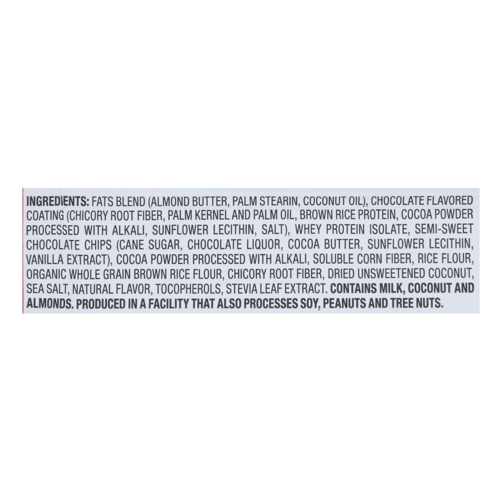 ingredients : fats blend (almond butter, palm stearin, coconut oil);chocolate flavored coating (chicory root fiber, palm kernel and palm oil, brown rice protein, cocoa powder processed with alkali, sunflower lecithin, salt);whey protein isolate;semi-sweet chocolate chips (cane sugar, chocolate liquor, cocoa butter, sunflower lecithin, vanilla extract);cocoa powder processed with alkali;soluble corn fiber;rice flour;organic whole grain brown rice flour;chicory root fiber;dried unsweetened coconut;sea salt;natu