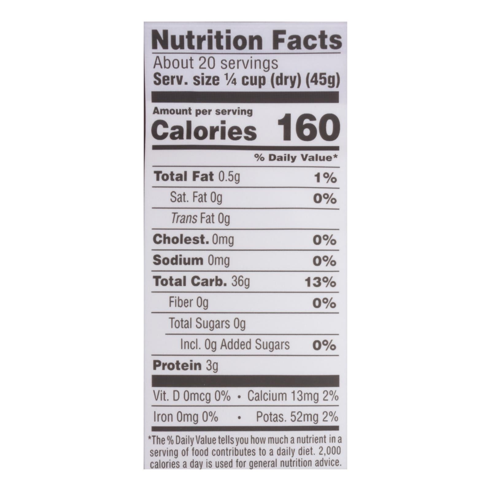 Savor the rich, aromatic essence of premium white basmati rice, grown sustainably in the heart of California. This organic, non-GMO whole grain rice is perfect for those who seek purity and nutrition in their meals. With each 32 oz bag providing 20 servings at 160 calories per serving, it's an ideal choice for health-conscious families.