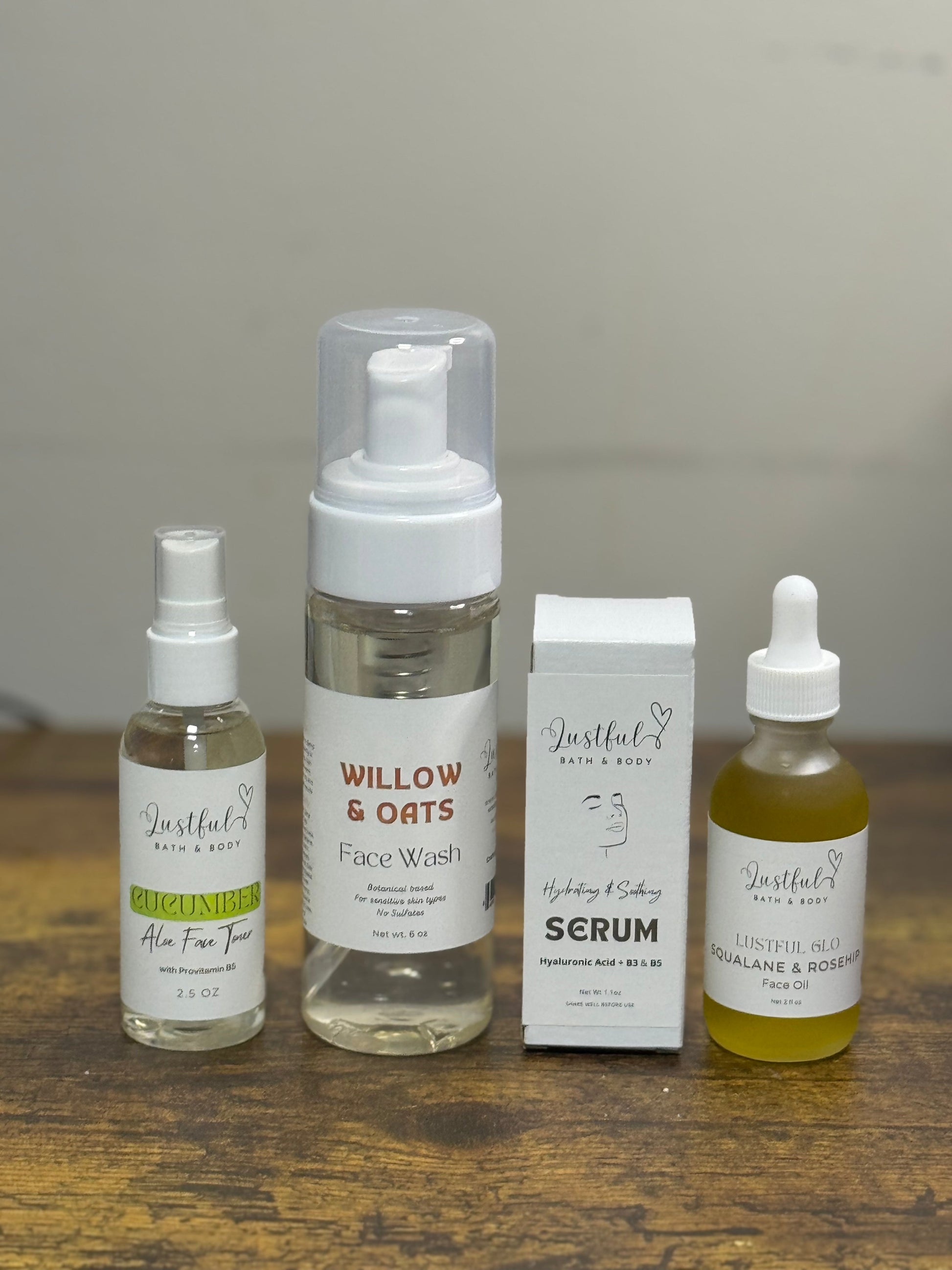 Embrace life at its best with the LUSTFUL GLO ULTIMATE FACE CARE KIT! Everything you need to keep your face lookin' & feelin' spectacular - Turmeric & Lemon Face Wash for a deep scrub, Ultra-Hydrating Face Toner for a resurgence, Hyaluronic Acid + B3 & B5 Serum to lighten up, and Squalane & Rosehip Face Oil to nourish. Using only natural ingredients, this kit is formulated for all skin types and especially sensitive and acne prone skin. Get glorious with our LUSTFUL GLO ULTIMATE FACE CARE KIT and let your face live it’s best life!