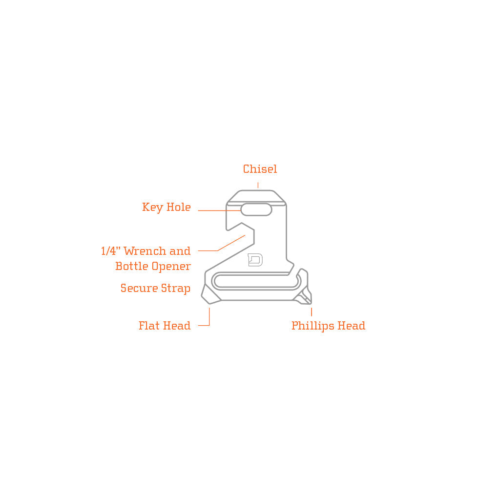 The M1 Spec-Ops Bifold Pocket variant comes with its pairing high carbon, heat treated MT04 Multi-Tool which has over 10 functions which are specifically designed to respond to emergency situations. The functions of the multi-tool include: a seat belt cutter, serrated/sharpened edges, chisel, 2 paracord tensioners, an O2 oxygen wrench, nail pryer, standard 1/4” inch hex wrench, and of course, a bottle opener. The MT04 Multi-Tool slides into the metal cavity where the cards sit and is nested securely onto the safety locks on the chassis.