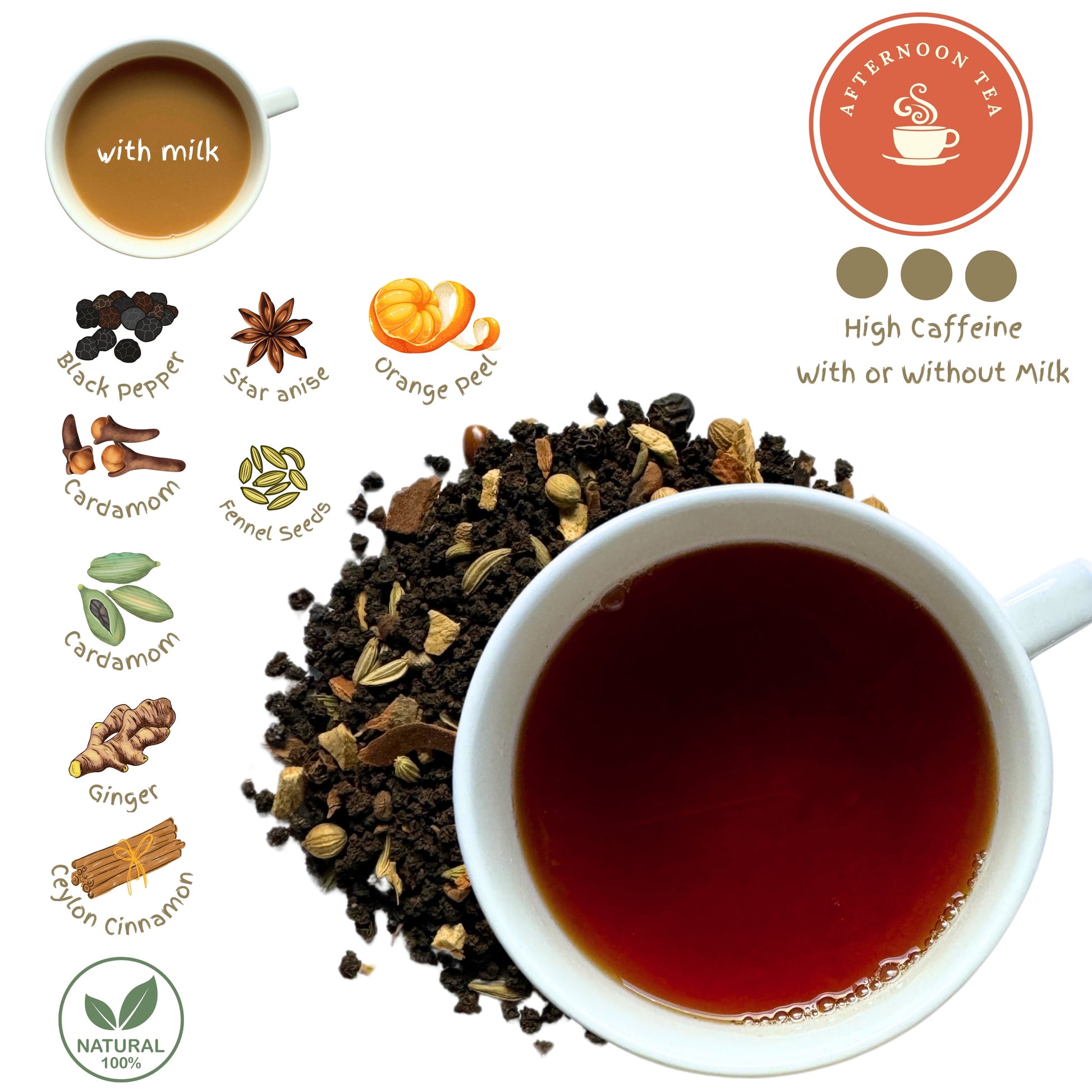 Together, these ingredients create a beautifully spiced cup with layers of complexity. Whether enjoyed with milk and sweetener for a creamy, comforting treat or brewed on its own for a pure, bold infusion, this masala chai is perfect for any chai lover looking for a rich, authentic experience.