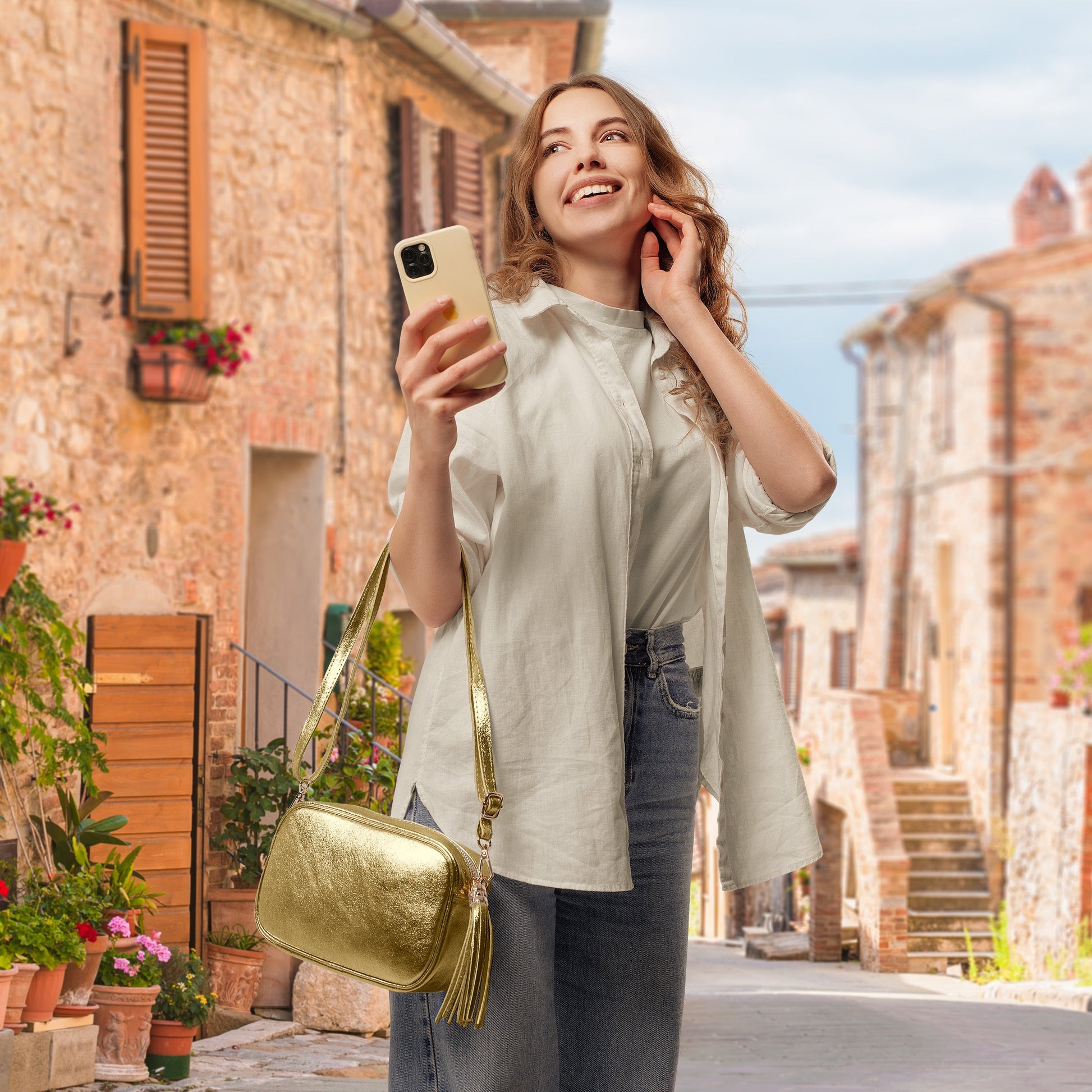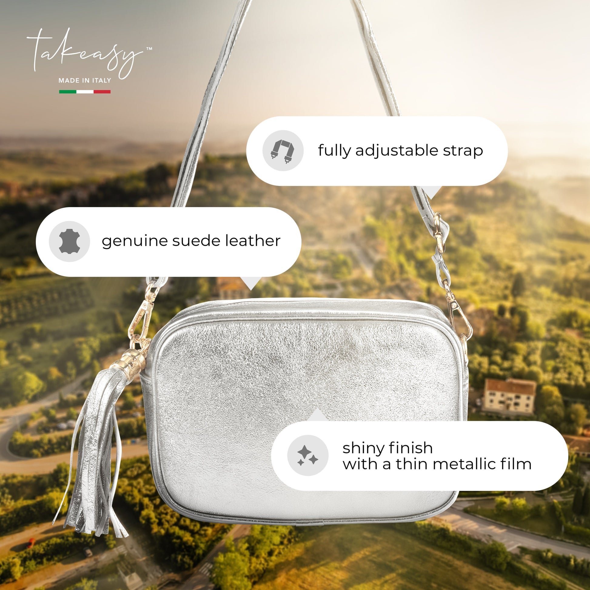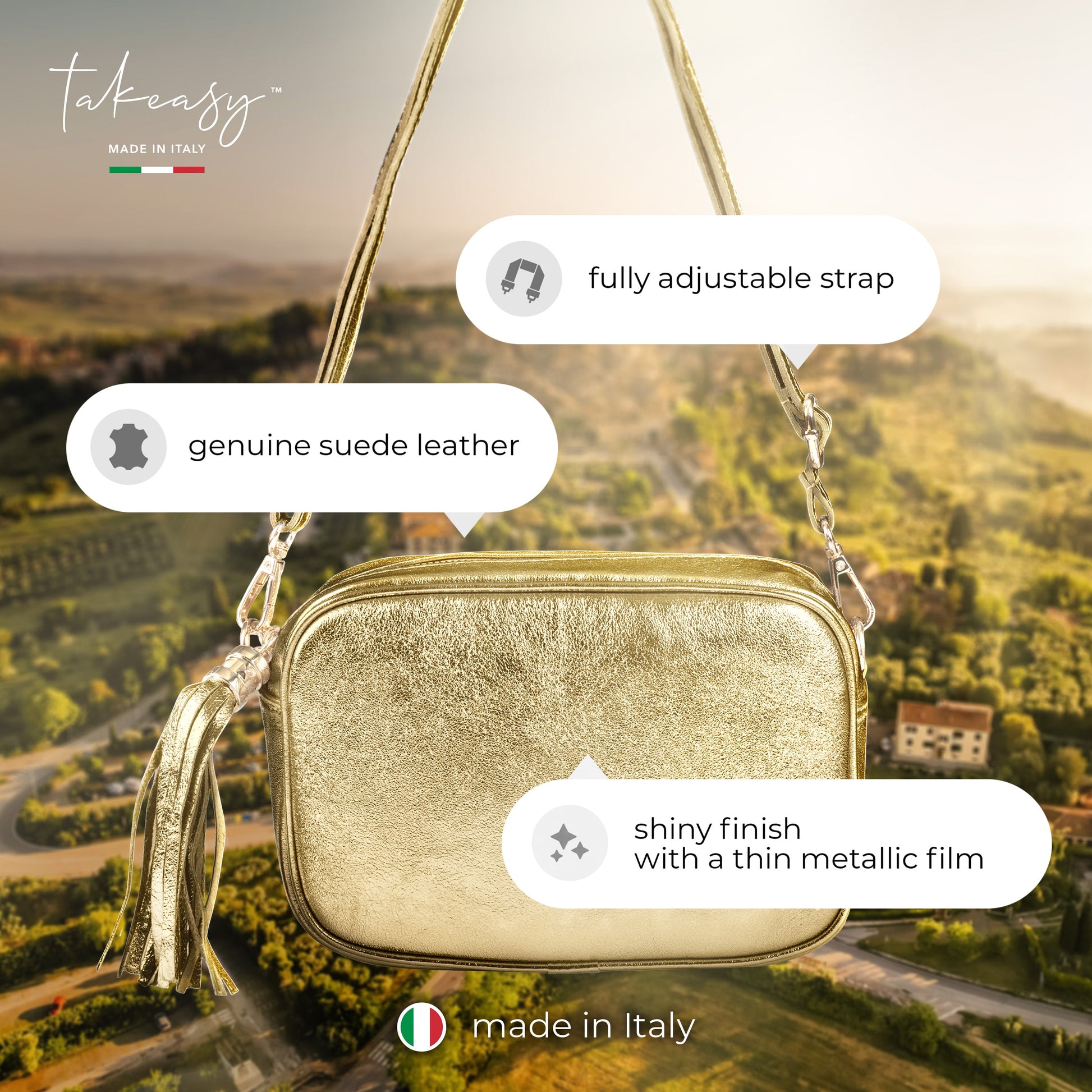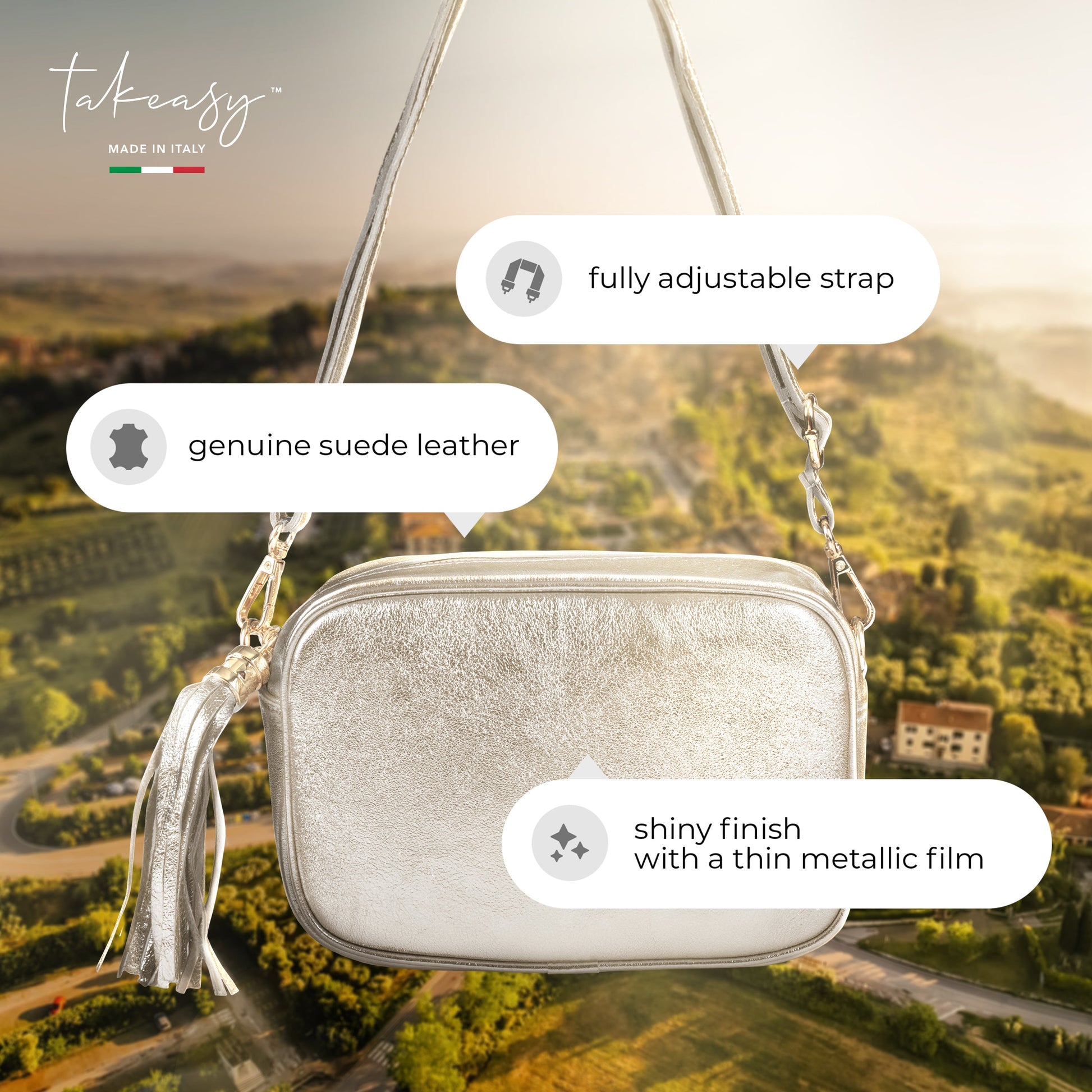 This exquisite mini bag from TAKEASY embodies refined Italian craftsmanship and artisanal quality. The thin metallic lamination on genuine suede glimmers softly with every movement, accentuating your unique style.