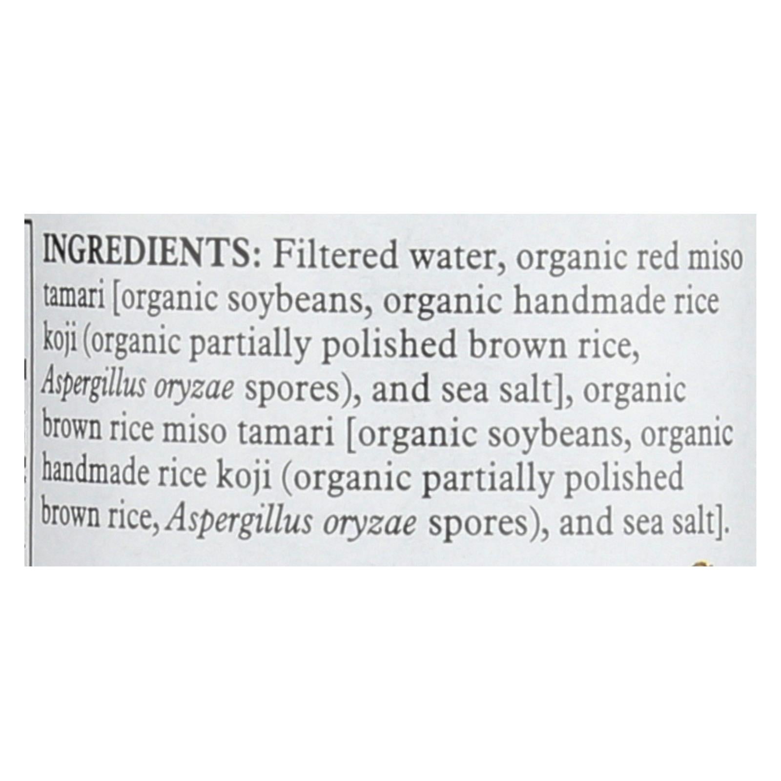 - Ingredients: Filtered Water; Organic Red Miso Tamari [Organic Soybeans; Organic Handmade Rice Koji; Organic Partially Polished Brown Rice; Aspergillus Oryzae Spores; and Sea Salt]; Organic Brown Rice Miso Tamari [Organic Soybeans; Aspegillus Oryzae Spores]