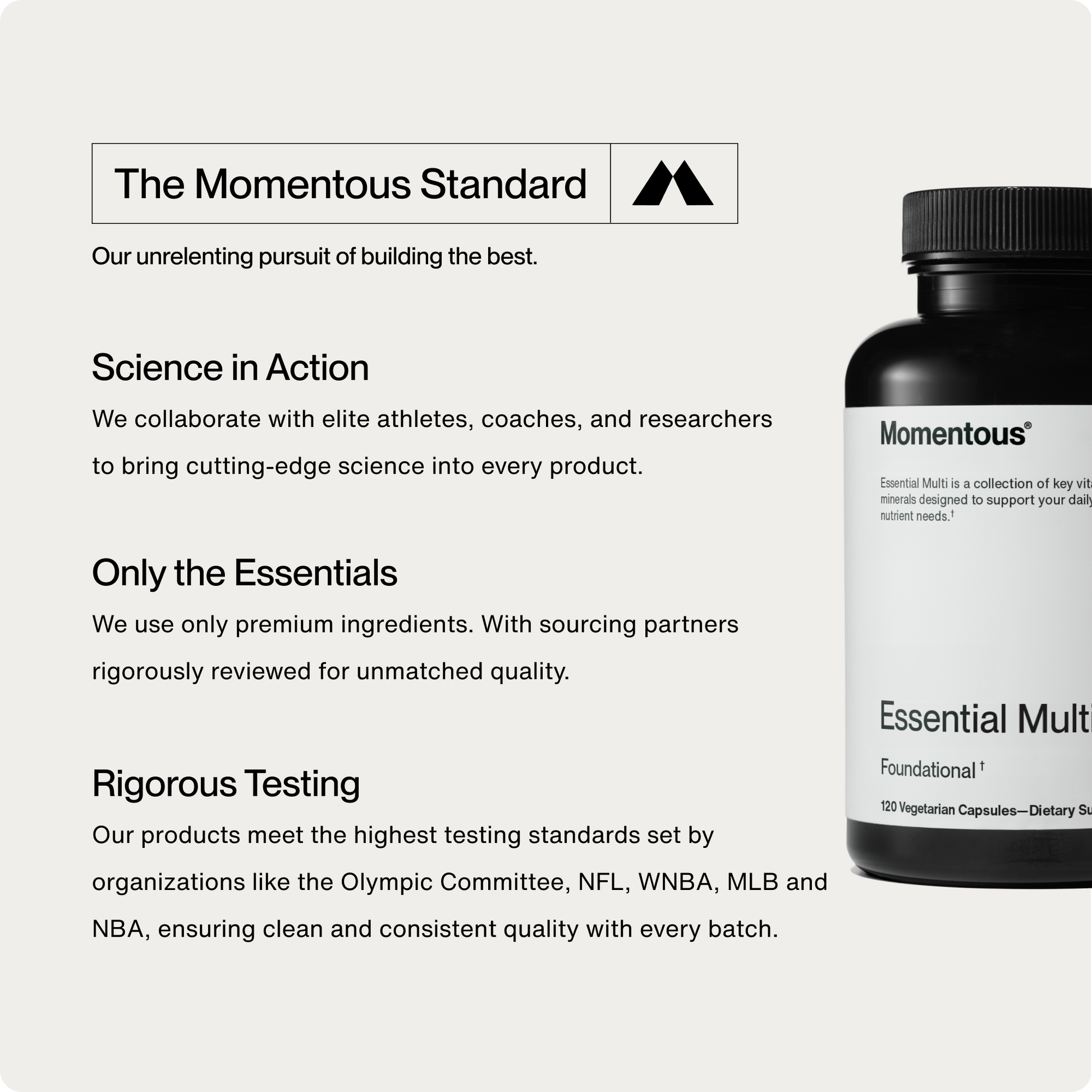 The Momentous Multivitamin is a comprehensive blend of essential vitamins, minerals, and phytonutrients designed to fill common dietary gaps and support overall health, energy, and immune function. Sourced from bioavailable forms and modeled after nutrient-dense whole foods, it delivers what your body needs without unnecessary fillers or megadosing.