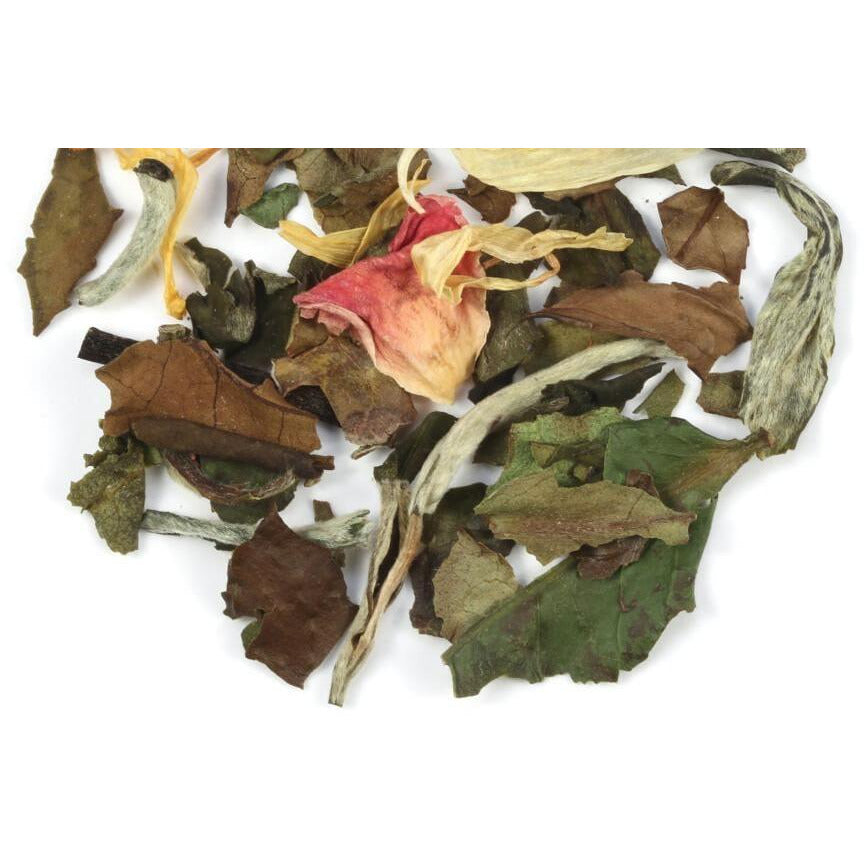 INGREDIENTS: White Tea, Green Tea, Jasmine, Natural Pineapple Flavor, Natural Peach Flavor, Rose Petals & Marigold Flowers