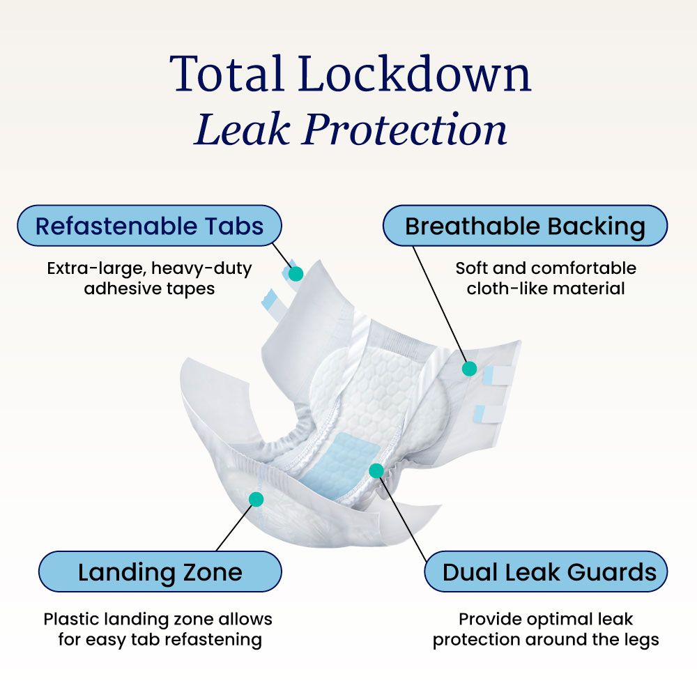 Experience the next level of comfort and reliability with our MEGAMAX AirLock Briefs. Enjoy the same exceptional 9-hour absorbency and breathable cloth-like exterior as our MEGAMAX Air, now enhanced with a more secure plastic frontal landing zone and heavy-duty adhesive tabs. For those who seek superior coverage, our extra-wide, extra-long contoured absorbent core is designed to provide added protection, ensuring peace of mind even for those who toss and turn during sleep. The elastics in both the front and rear waistbands keep the brief snugly in place against your body.