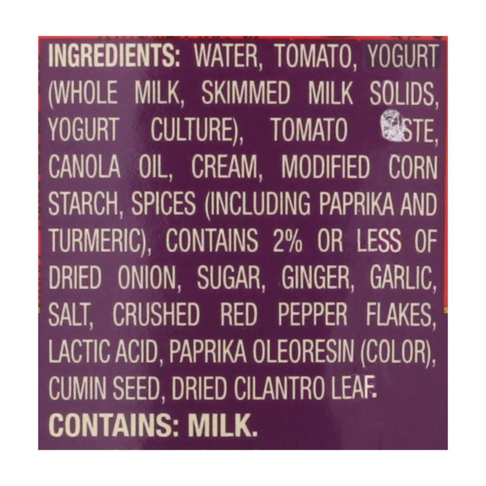 ingredients : water;tomato;yogurt (milk, skim milk cream, bacterial culture);tomato paste;food starch-modified;cream;spices (including paprika, turmeric and smoked paprika);contains 2% or less of canola oil;dried onion;sugar;garlic;ginger;salt;crushed red pepper flakes;whey protein concentrate;lactic acid;paprika oleoresin (color);cumin seed;dried cilantro leaf