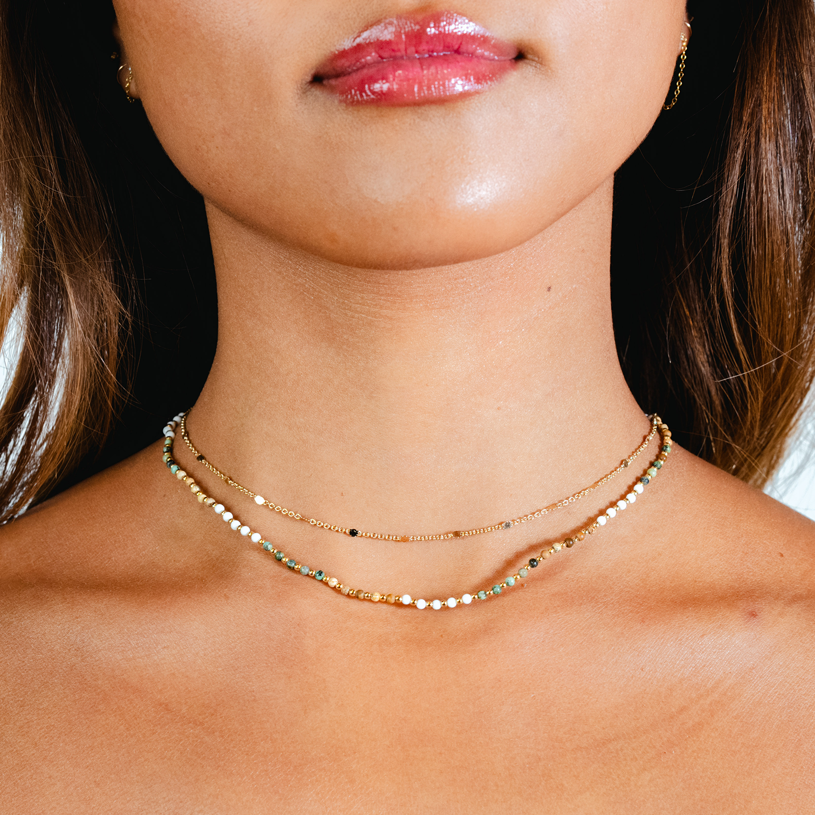 Our 2mm Healing Peace Protector Necklace, paired with the delicate sparkle of our Circles in the Sand Necklace, brings a full spectrum of calming energy and subtle shine.