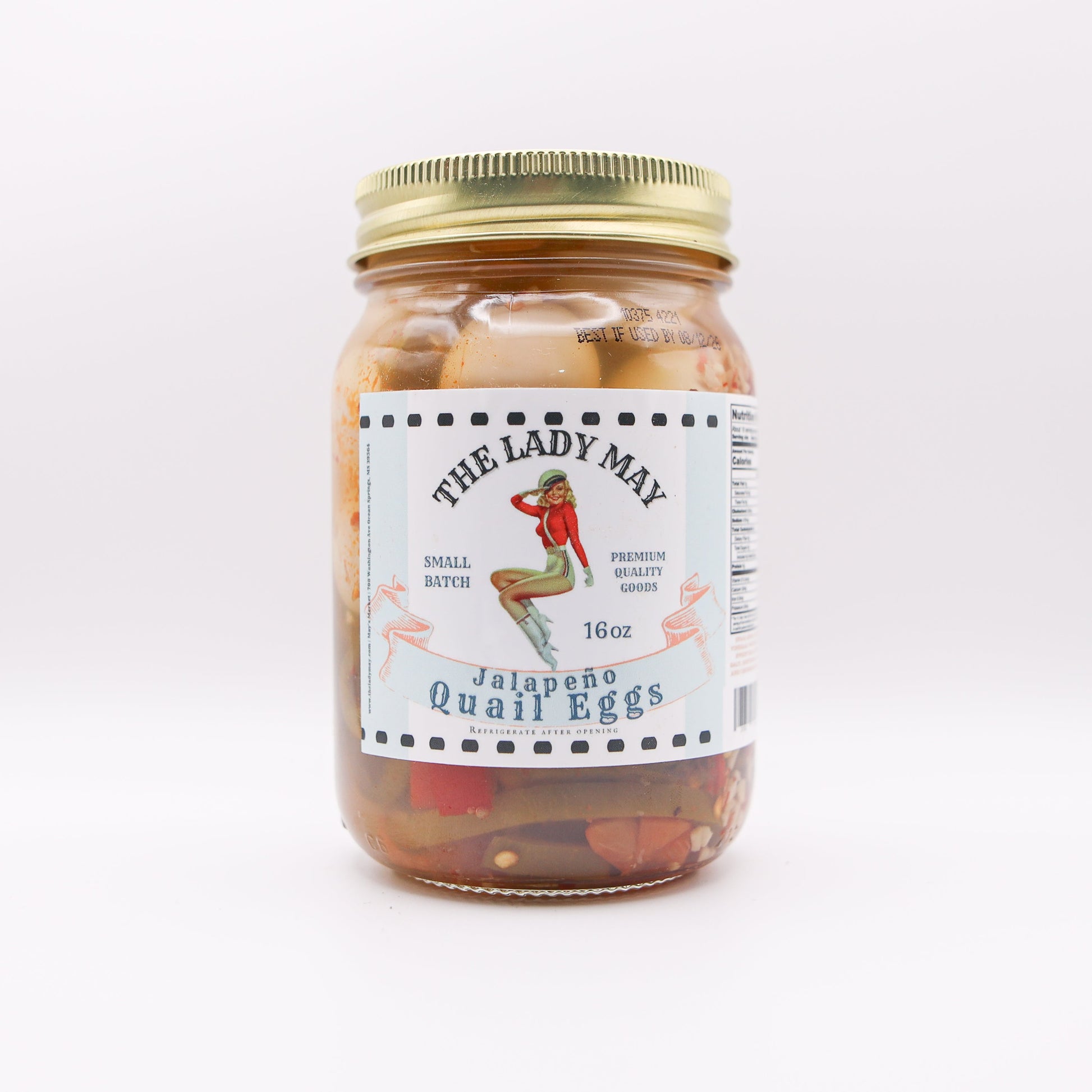 The Lady May's Pickled Jalapeño Quail Eggs for a spicy kick. Perfect for charcuterie boards, snacks, or adding an adventurous twist to your meals, this jar offers something for every palate.