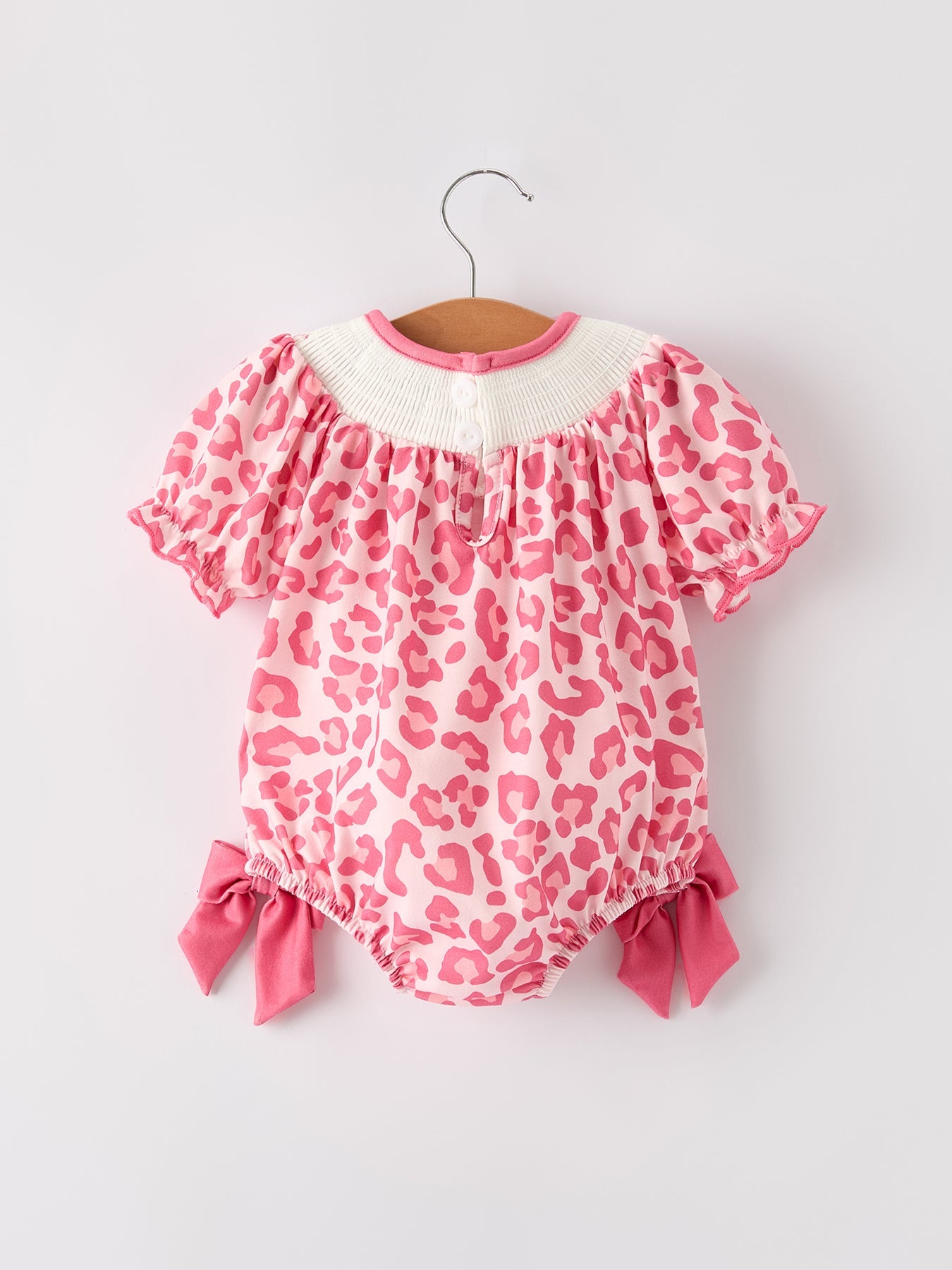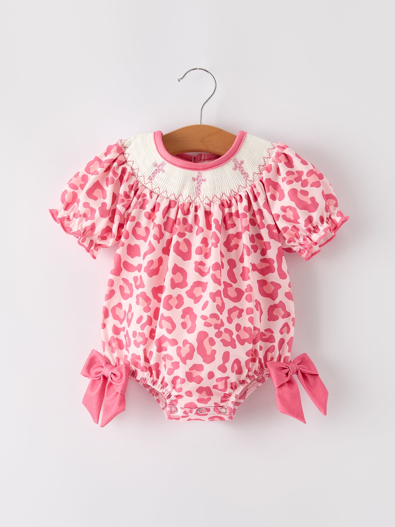 Elevate your little one's special occasions with our Pink Smocked Church Romper. This exquisite bishop-style christening outfit features delicate smocking and a charming leopard accent, creating the perfect blend of tradition and style. Crafted for comfort and designed to make memories, this romper ensures your baby girl looks absolutely precious during religious ceremonies, family gatherings, or professional photos.