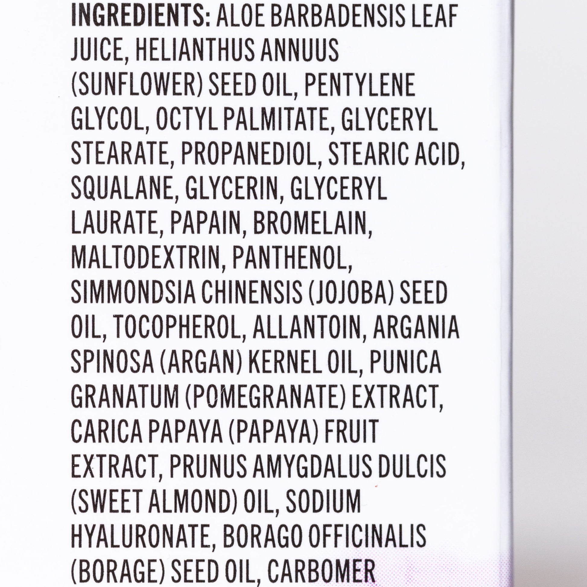 INGREDIENTS: ALOE BARBADENSIS LEAF JUICE, HELIANTHUS ANNUUS (SUNFLOWER) SEED OIL, PENTYLENE GLYCOL, OCTYL PALMITATE, GLYCERYL STEARATE, PROPANEDIOL, STEARIC ACID, SQUALANE, GLYCERIN, GLYCERYL LAURATE, PAPAIN, BROMELAIN, MALTODEXTRIN, PANTHENOL, SIMMONDSIA CHINENSIS (JOJOBA) SEED OIL, TOCOPHEROL, ALLANTOIN, ARGANIA SPINOSA (ARGAN) KERNEL OIL, PUNICA GRANATUM (POMEGRANATE) EXTRACT, CARICA PAPAYA (PAPAYA) FRUIT EXTRACT, PRUNUS AMYGDALUS DULCIS (SWEET ALMOND) OIL, SODIUM HYALURONATE, BORAGO OFFICINALIS (BORAGE) SEED OIL, CARBOMER