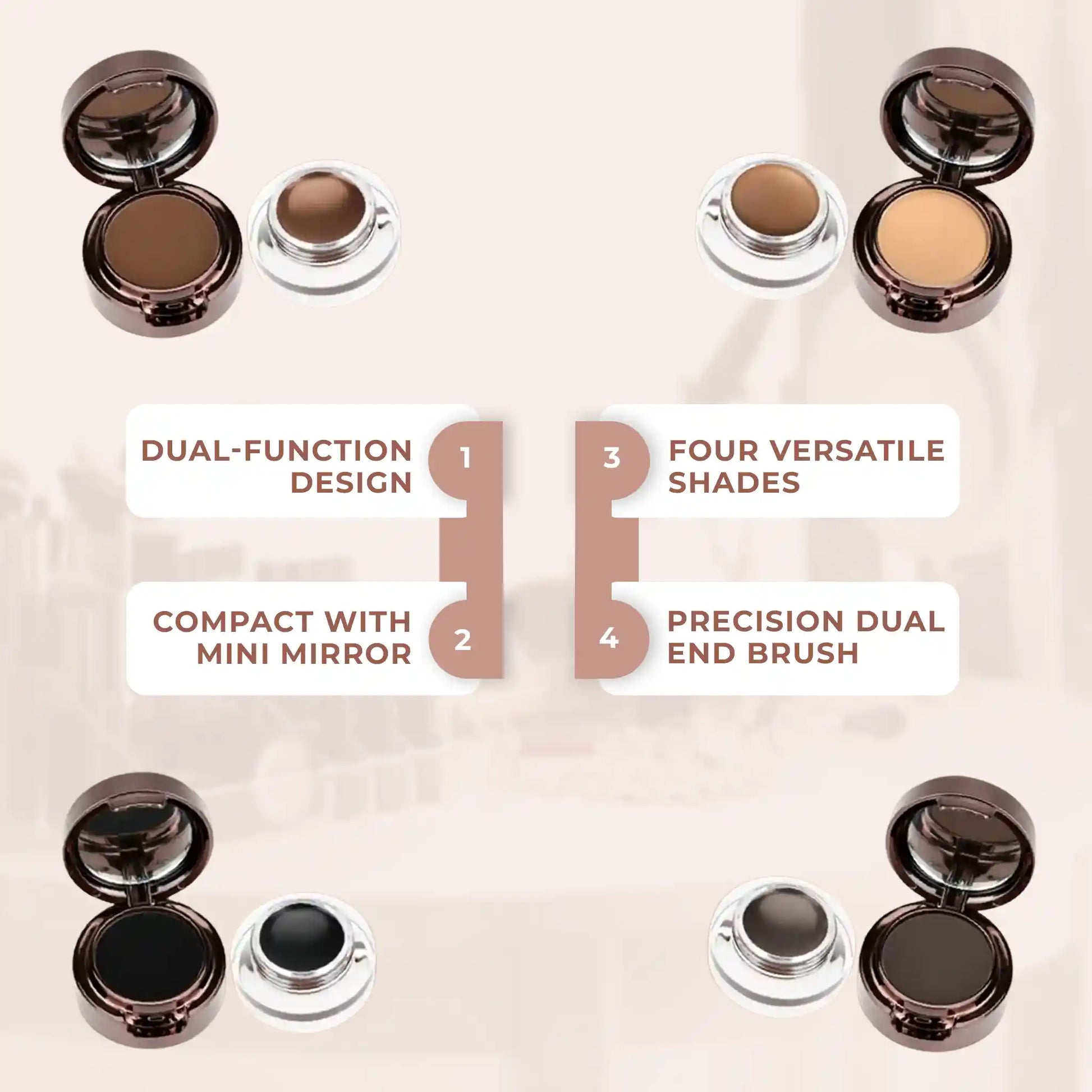It offers a dual-function design, four shades, and precision tools for smudge-proof, natural brows.