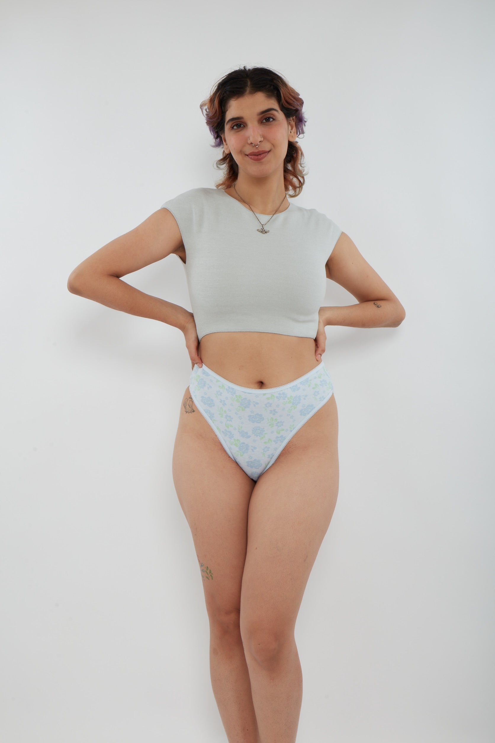 Series of printed cotton bikinis. These beauties are both comfortable and flattering, with a pretty high waist/high leg silhouette and a lovely delicate lace trim. Available in sizes XS-2X. Collect all three prints! Also available as a thong.