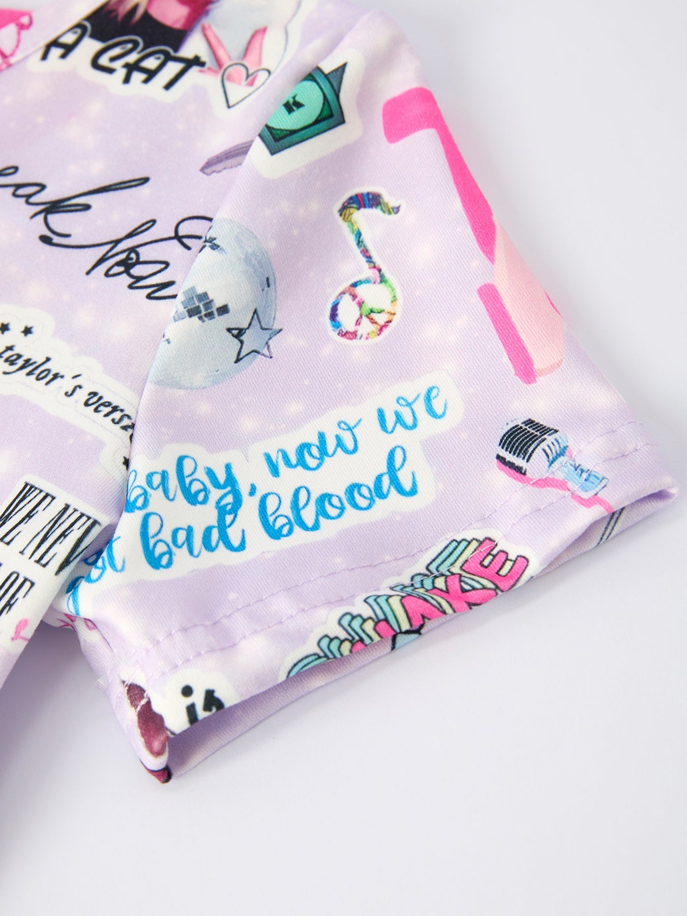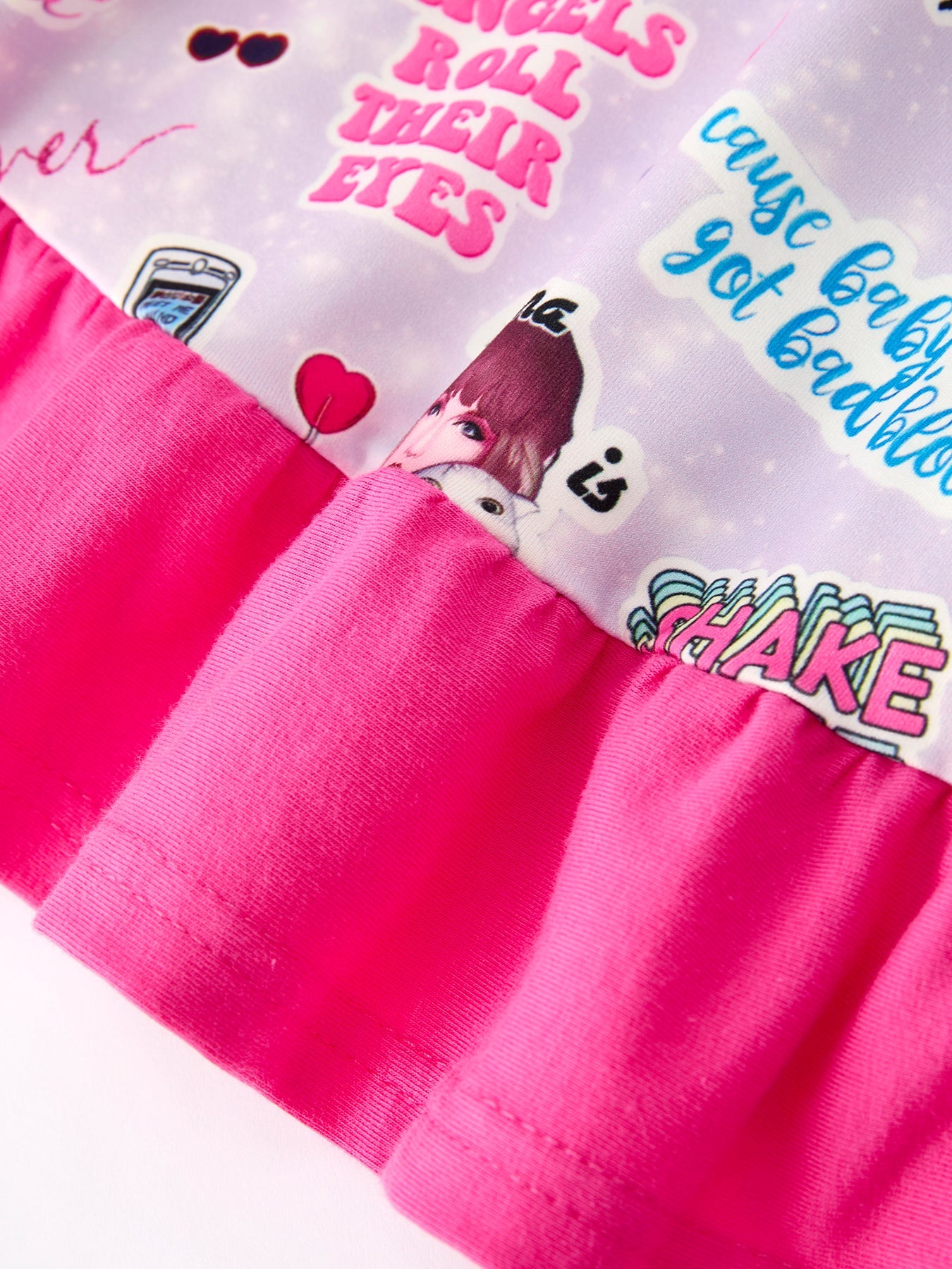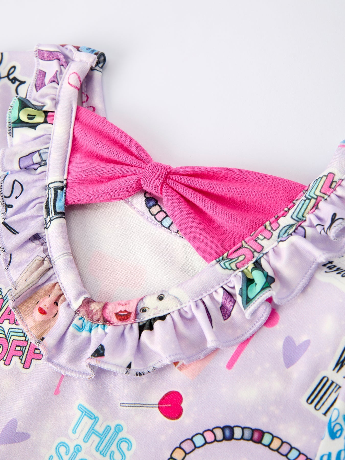 Purple TS Print Ruffle Girls' Short Sleeve Christmas Dress