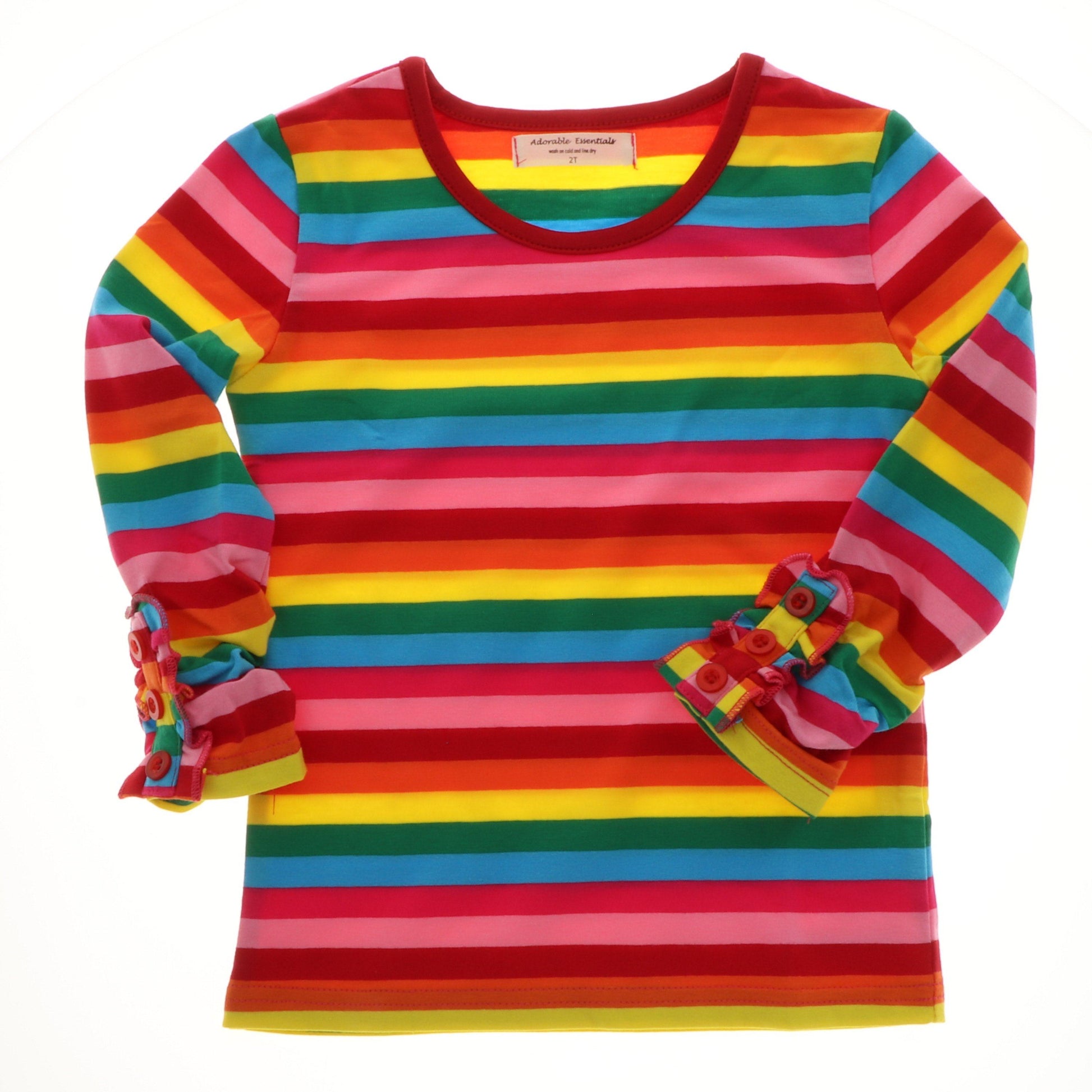 The Rainbow Button Ruffle Shirt is a new style in our Rainbow Runway collection. The shirt is simple with a touch of buttons and ruffles at the cuff to add a trendy touch to any outfit. Available in Primary Rainbow AND Unicorn Rainbow.