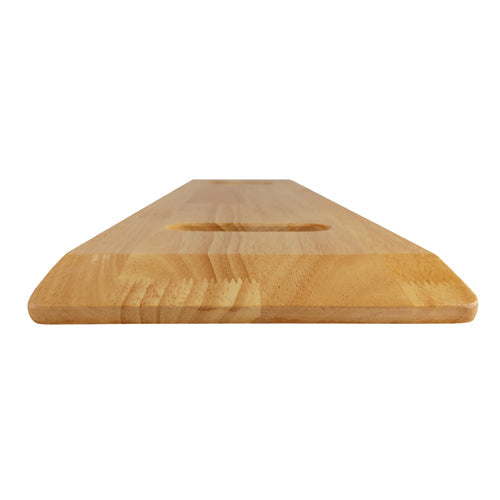 This Slide On Over Transfer Board measures 8" x 24" x ½", with tapered ends to 1/8" for smooth transitions. Constructed from durable hardwood, it supports a weight capacity of up to 300 lbs. Its design prioritizes both user and caregiver safety, ensuring a controlled and comfortable transfer experience. The transfer board's rounded corners and smooth finish further minimize the risk of skin irritation or injury during use. The two open hand cutouts provide a secure grip, allowing for precise placement and control during transfers.