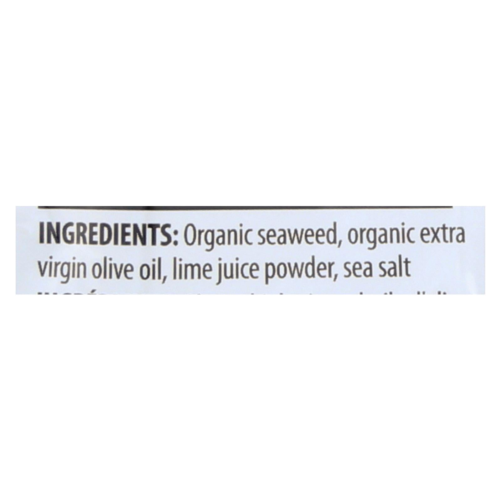 - Ingredients include organic seaweed, extra virgin olive oil, lime juice powder, and sea salt