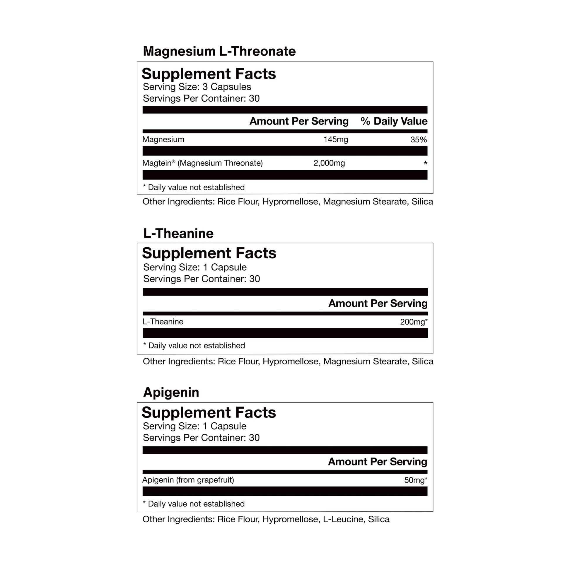The Sleep 30-Pack delivers a full month of melatonin-free, research-backed sleep support with a calming blend of Magnesium L-Threonate, Apigenin, and L-Theanine. Together, these ingredients help ease the body and mind into a restful state, reduce nighttime wakeups, and promote deeper, higher-quality sleep.