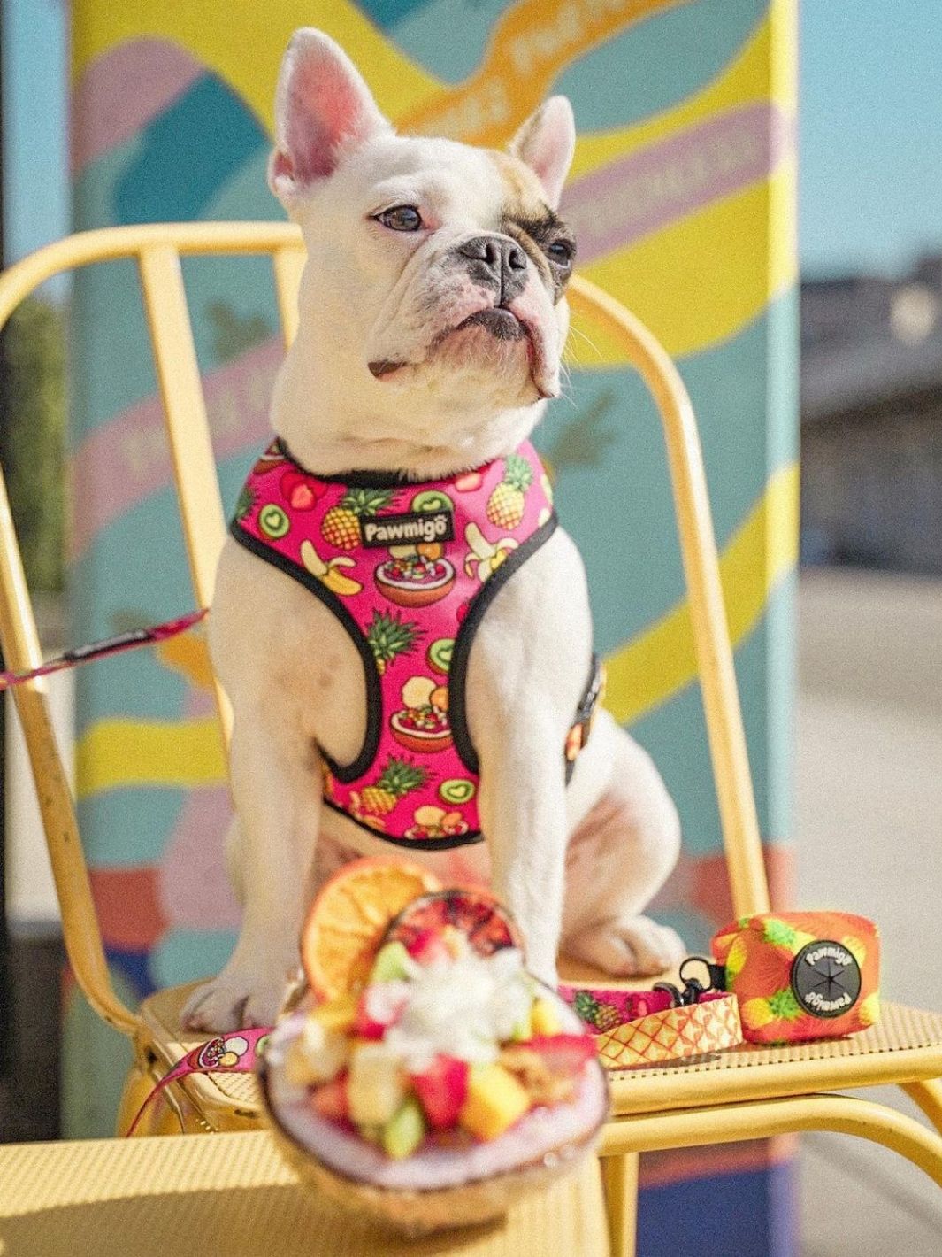 One side features a playful mix of tropical fruits like kiwi, strawberry, pineapple, and banana on a vibrant pink background, while the other side brings the sunshine with a bright pineapple-inspired orange print. Paired with a matching orange poop bag holder dotted with pineapples, this leash kit is a juicy way to sweeten up every walk! š„„š
