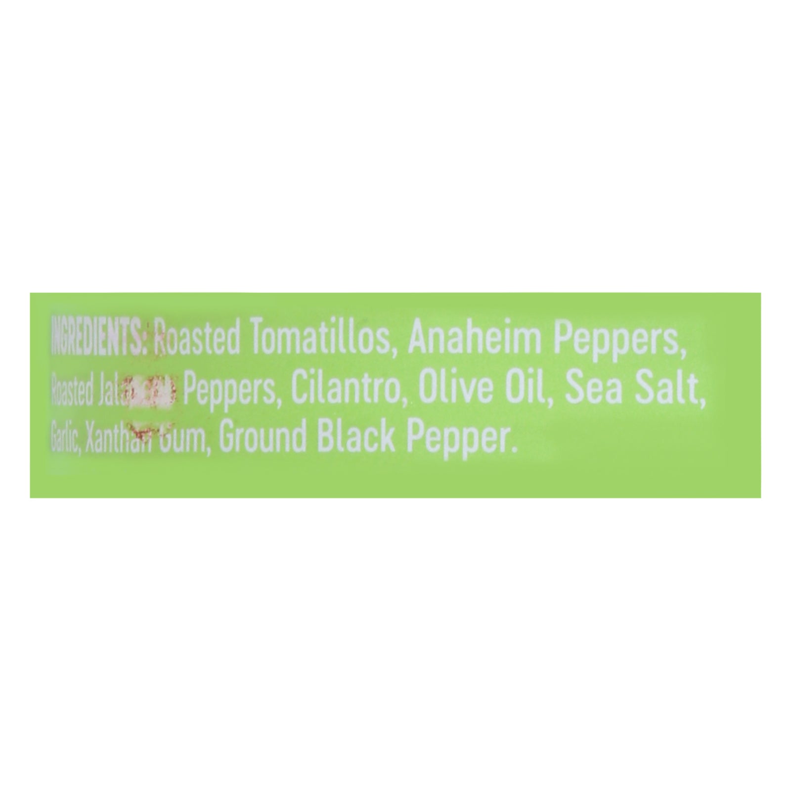 ingredients : roasted tomatillos;anaheim peppers;roasted jalapeno peppers;cilantro;olive oil;sea salt;garlic;xanthan gum;ground black pepper