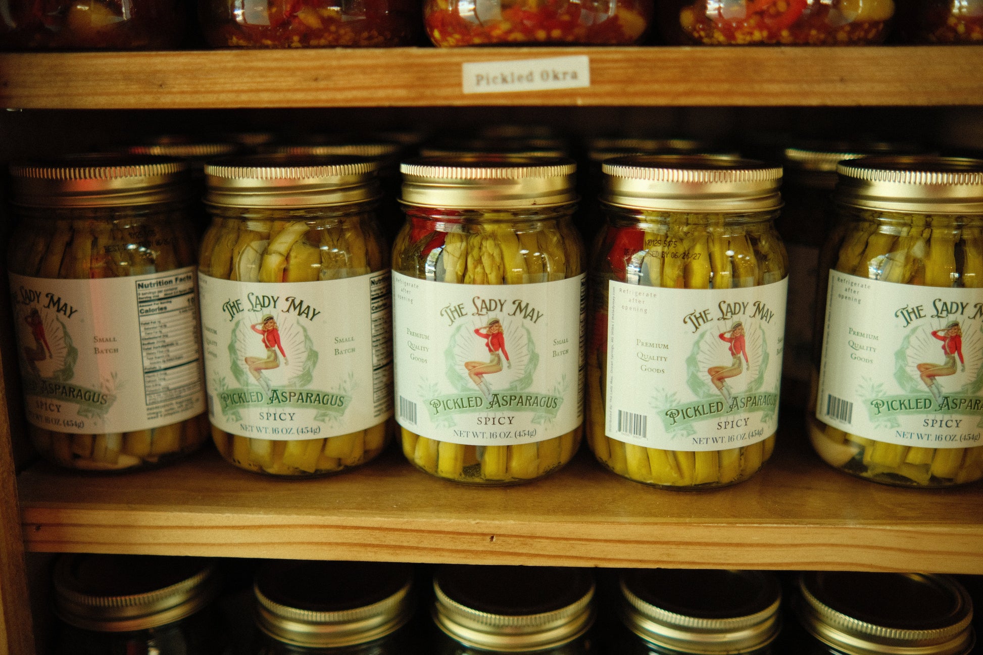 The Lady May's Pickled Asparagus are hand packed with flavor, fresh peeled cloves of garlic with a touch of jalapeño heat.