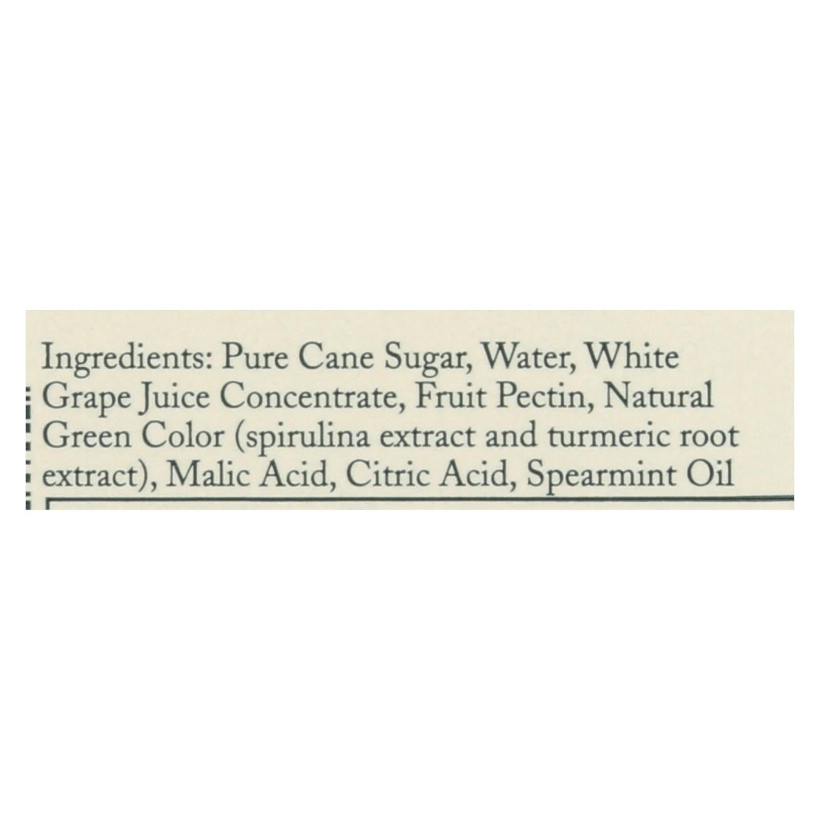 - Ingredients: Pure cane sugar, water, white grape juice concentrate, fruit pectin, natural green color, spirulina extract and turmeric root extract, malic acid, citric acid, spearmint oil