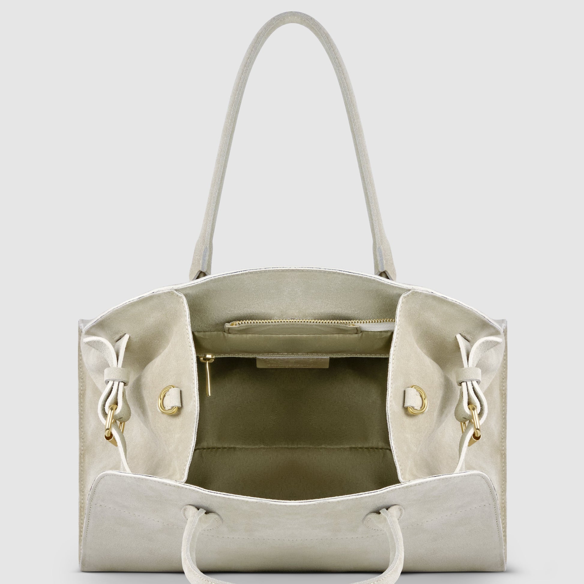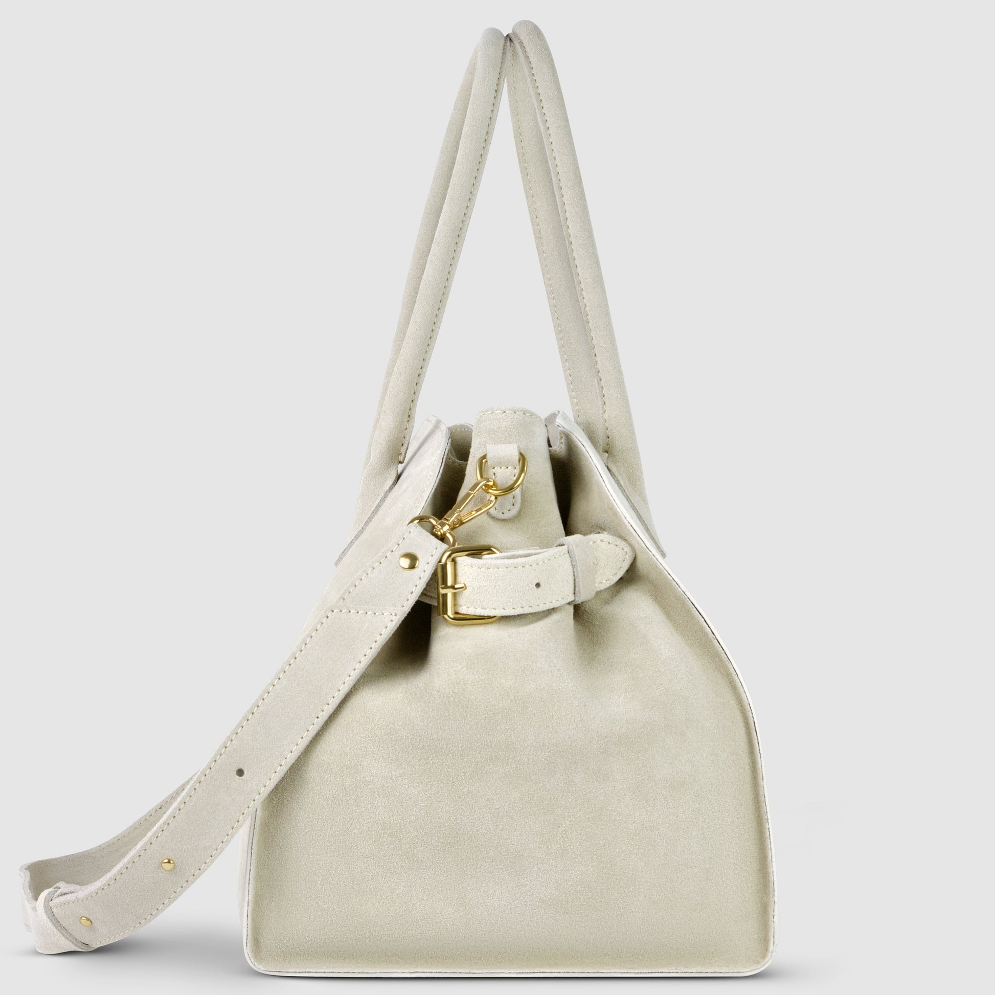 This doctor's bag-style purse is a modern take on timeless Italian elegance. Its architectural shape, artisanal finishing, and balanced proportions make it a statement piece. Handcrafted in Italy using traditional leathercraft techniques. The body is made of premium genuine suede — soft, velvety, and irresistibly touchable. Thanks to Florentine tanning traditions, the leather retains depth and richness while staying durable. The suede conforms beautifully to the structured shape, highlighting its volume and character. Inside, a sturdy polyester twill lining with a diagonal weave keeps your belongings protected. The spacious interior includes a zip pocket and an open slip pocket — ideal for your phone, keys, or other everyday essentials. Two short handles offer an elegant in-hand carry, while the detachable, adjustable strap allows you to wear it on your shoulder or crossbody. The secure zipper closure, golden hardware, and unique fifth base foot add both function and flair. Perfect for those who value style, craftsmanship, and practicality, this bag blends seamlessly with business looks, smart casual outfits, or everyday chic. It’s made to move with you through the city in style.