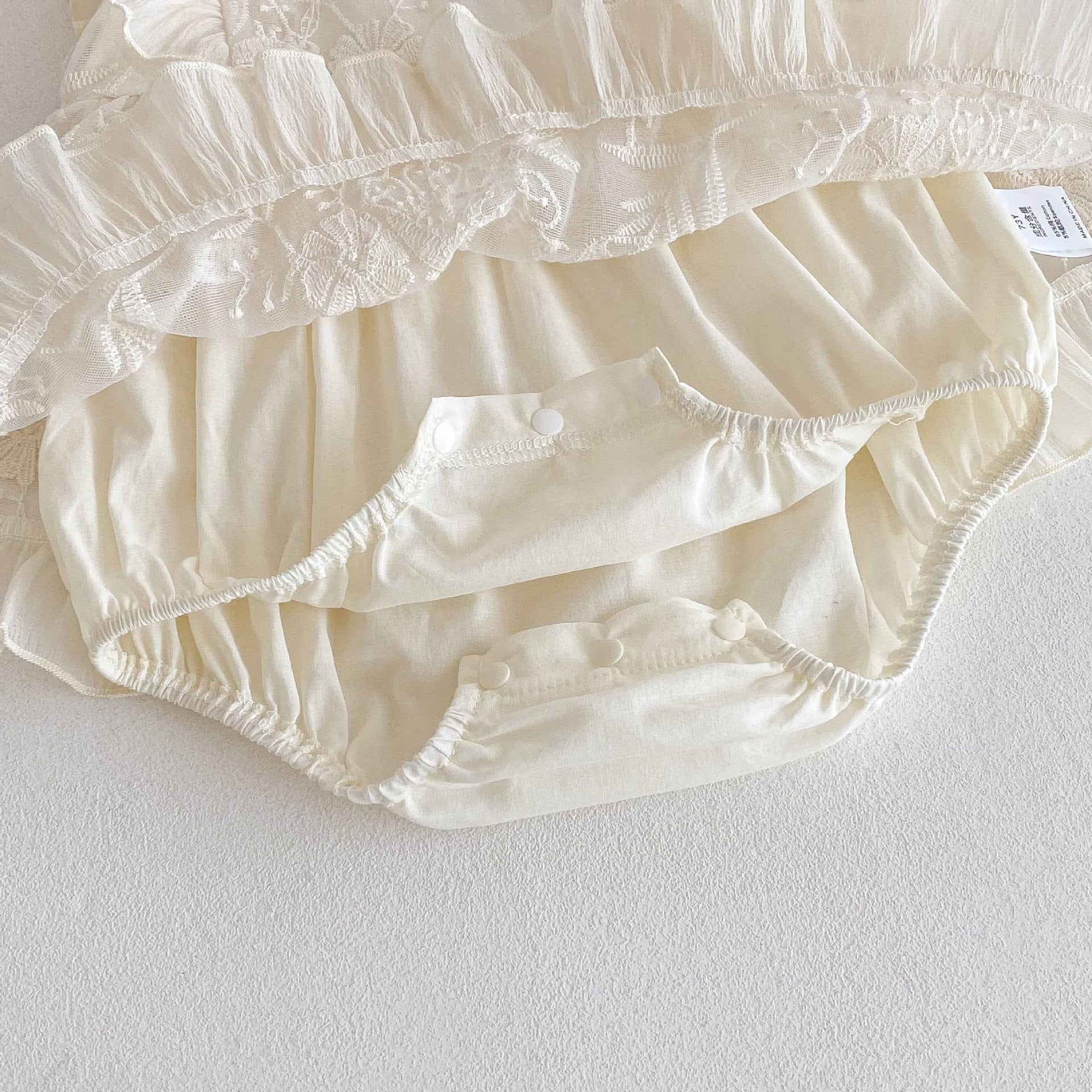 This charming baby girls' onesie features a delicate floral embroidery and elegant fly sleeves, crafted in a solid color perfect for summer. Designed to combine comfort with refined style, it offers a graceful silhouette ideal for warm days. A sophisticated choice for your little one’s wardrobe, blending softness with timeless appeal.