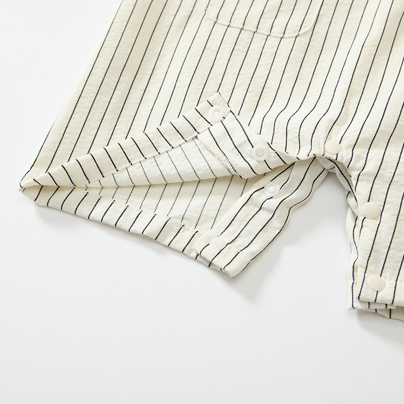 Embrace the warmth of summer with this unisex baby romper, featuring a charming striped pattern and sleeveless design. Crafted for comfort and style, it allows your little one to stay cool and move freely during sunny days. Perfect for everyday wear or special outings, this romper combines practicality with a refined, timeless look.