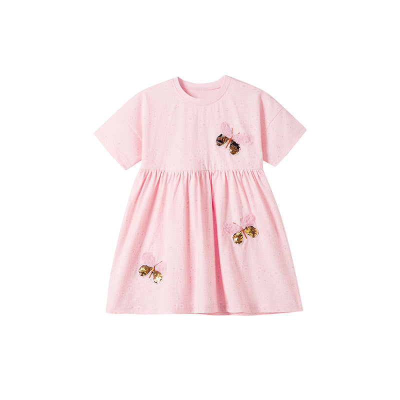 This playful pink dress features sparkling sequin butterflies that catch the light with every twirl. Designed with short sleeves, it keeps your little one cool and comfortable during sunny days. Perfect for stylish girls who love to shine and stand out at any summer gathering.