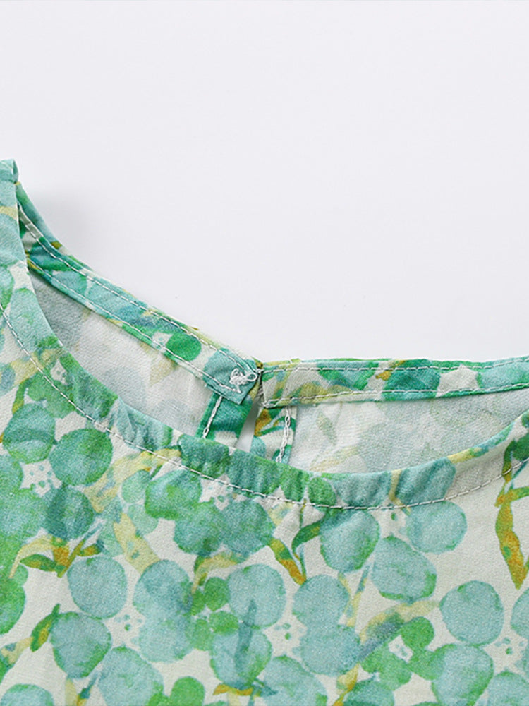 Summer Design Girls’ Oil Painting Flowers Pattern Short Sleeves Crew Neck Dress