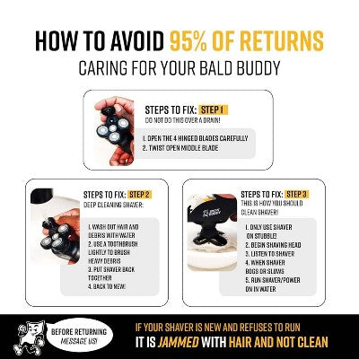 Head Shavers For Bald Men, Water Resistant Replaceable Head, Rechargeable, Electric, Cordless, Ergonomic Bald Buddy - Tired of razor burns, irritation, and awkward shaves? No more painful nicks and cuts! Join countless satisfied users who’ve already switched from their old, unreliable razors for a more comfortable, smooth, irritation-free shave every time and hassle-free experience. How to use: Step 1: Prep with Shaving Cream