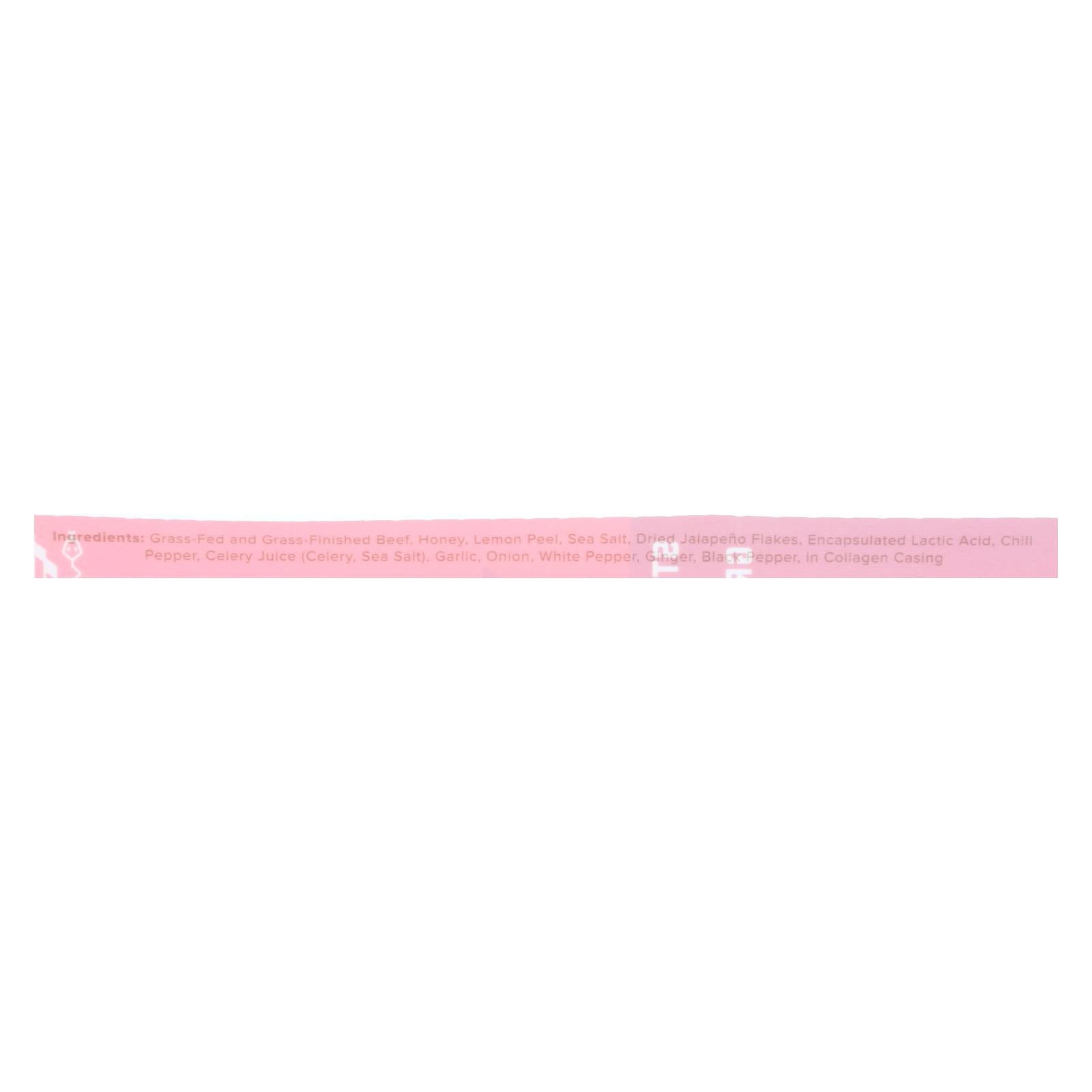 Satisfy your craving for bold flavors with these spicy beef sticks crafted from grass-fed and grass-finished beef. Each 1 oz. stick is packed with a tantalizing blend of honey, lemon peel, and a kick from dried jalapeno flakes and chili pepper. USDA inspected, these snacks are both certified gluten-free and paleo-friendly, making them a guilt-free treat.