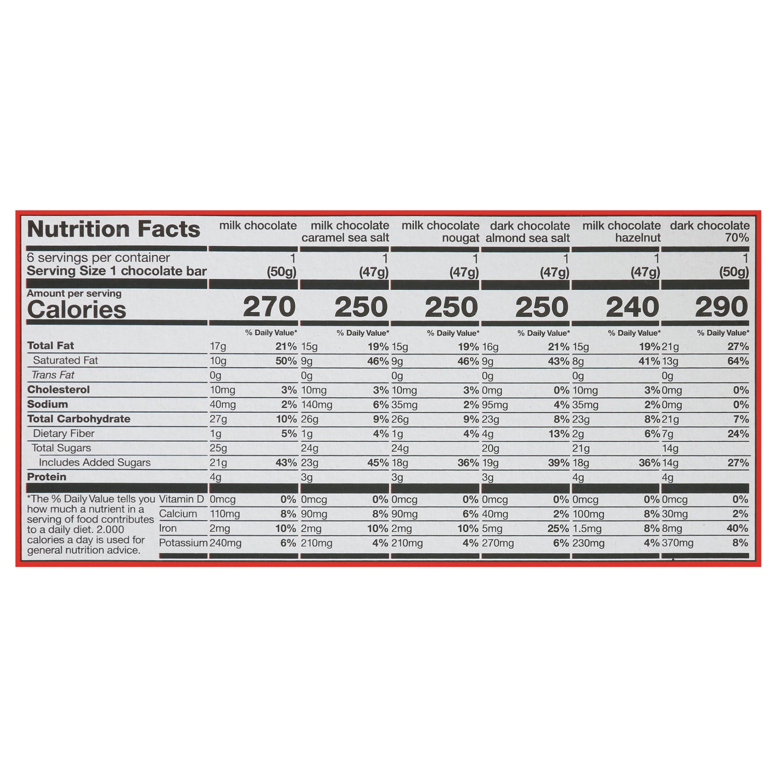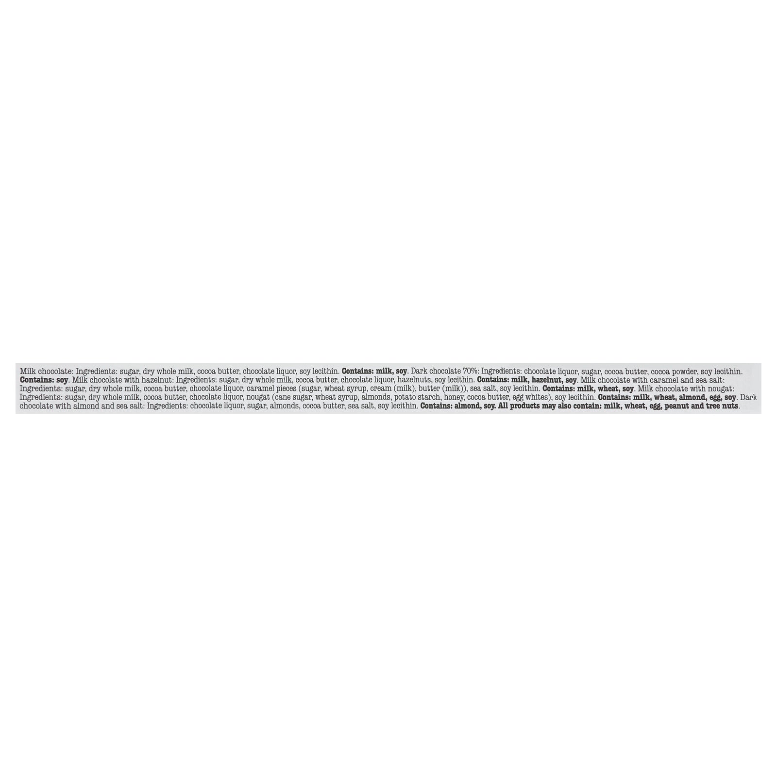 ingredients : dark chocolate 70%: chocolate liquor, sugar, cocoa butter, cocoa powder, soy lecithin;dark chocolate with almond and sea salt: chocolate liquor, sugar, almonds, cocoa butter, sea salt, soy lecithin;milk chocolate with caramel and sea salt: sugar, dry whole milk, cocoa butter, chocolate liquor, caramel pieces (sugar, wheat syrup, cream (milk), butter (milk), sea salt, soy lecithin;milk chocolate with hazelnut: sugar, dry whole milk, cocoa butter, chocolate liquor, hazelnuts, soy lecithin;milk cho