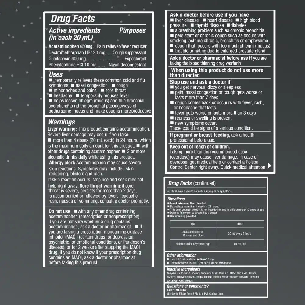 - Multi-Symptom Relief: Eases sore throat, cough, nasal congestion, and chest congestion.
