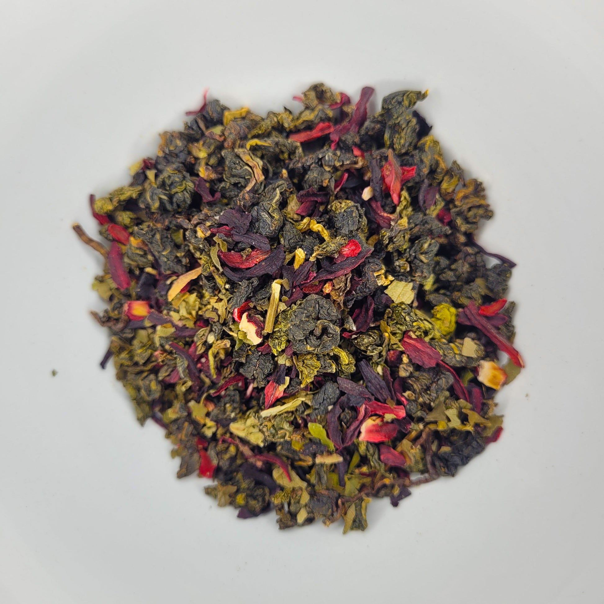 INGREDIENTS: Oolong Tea, Hibiscus, Raspberry Leaves, Cherry & Lychee Flavorings