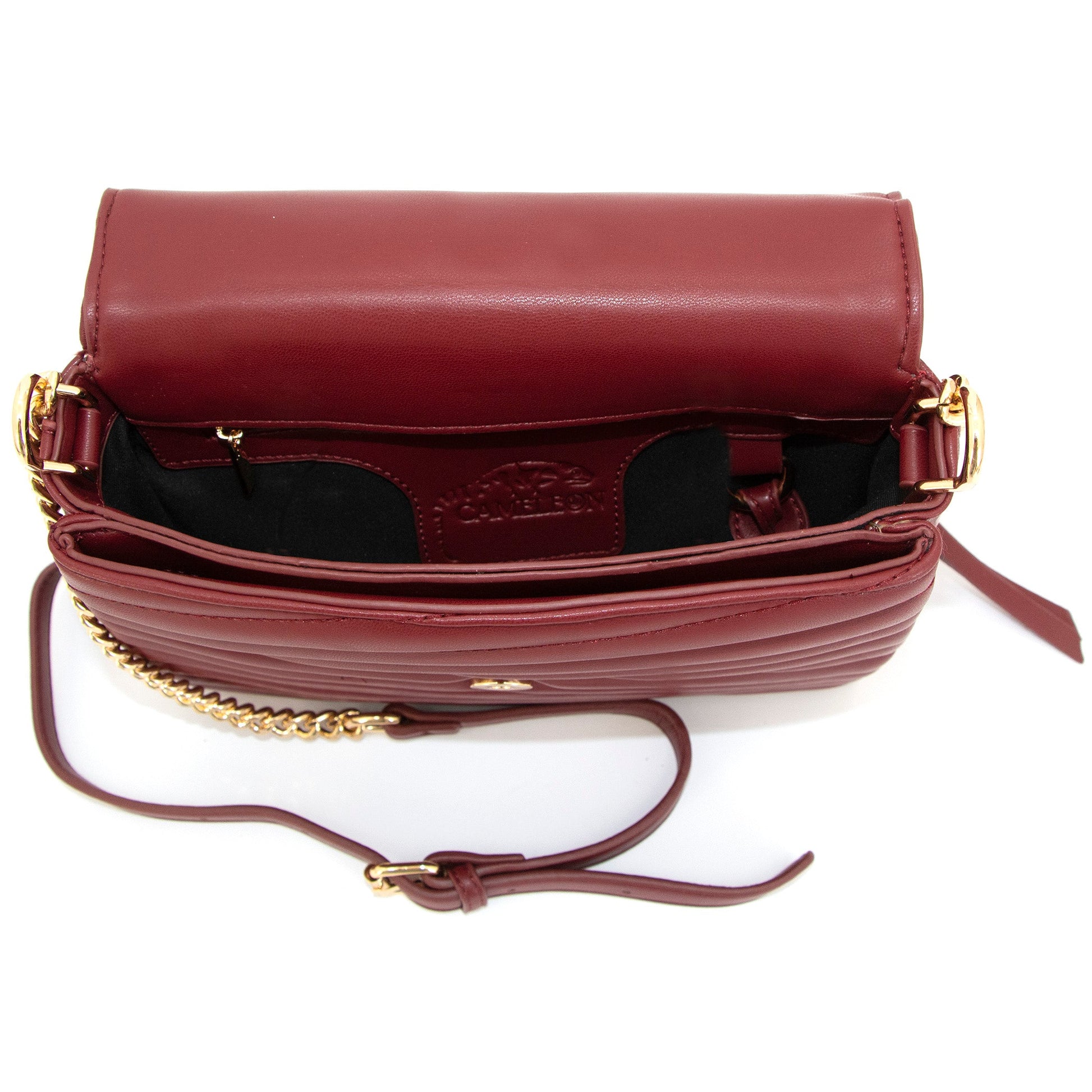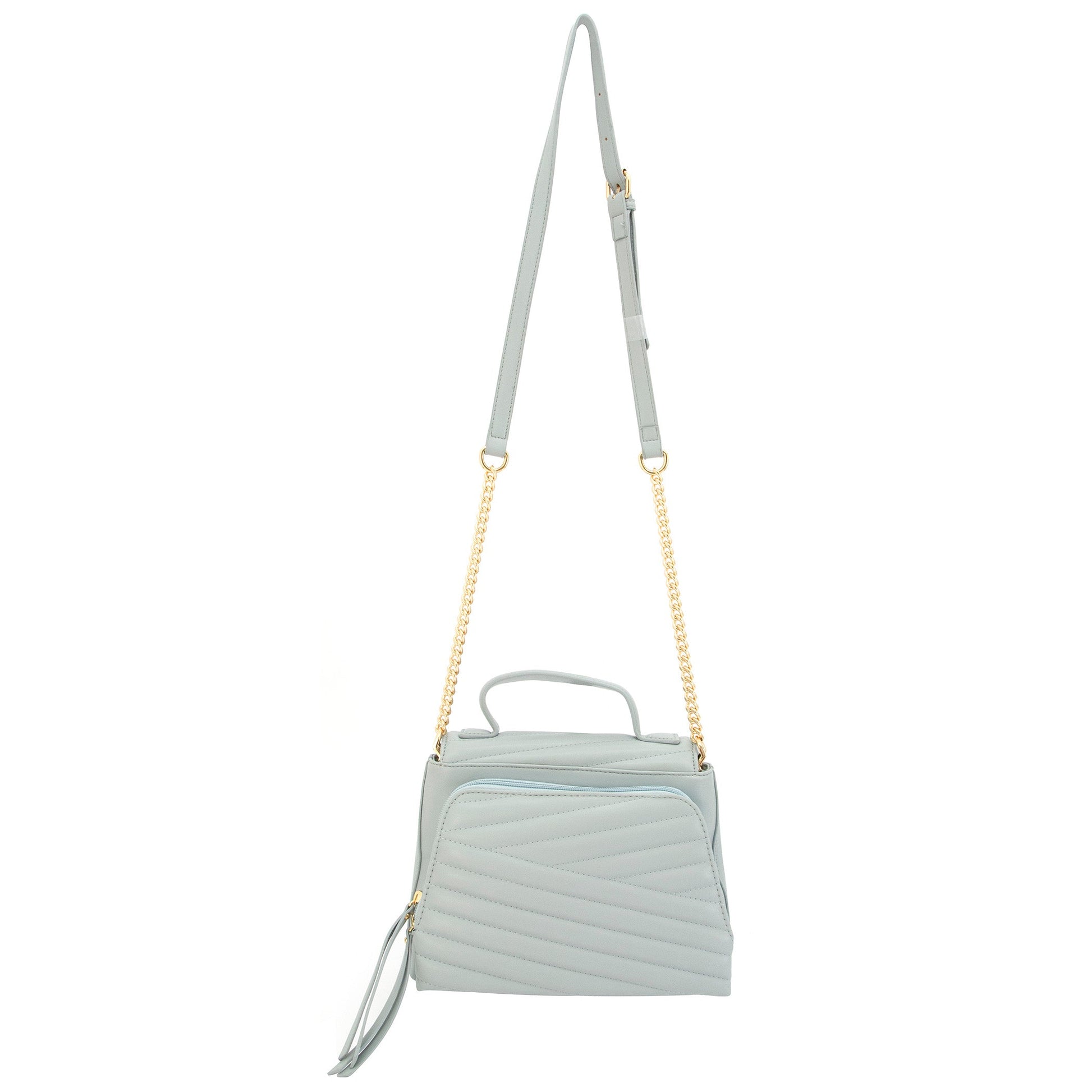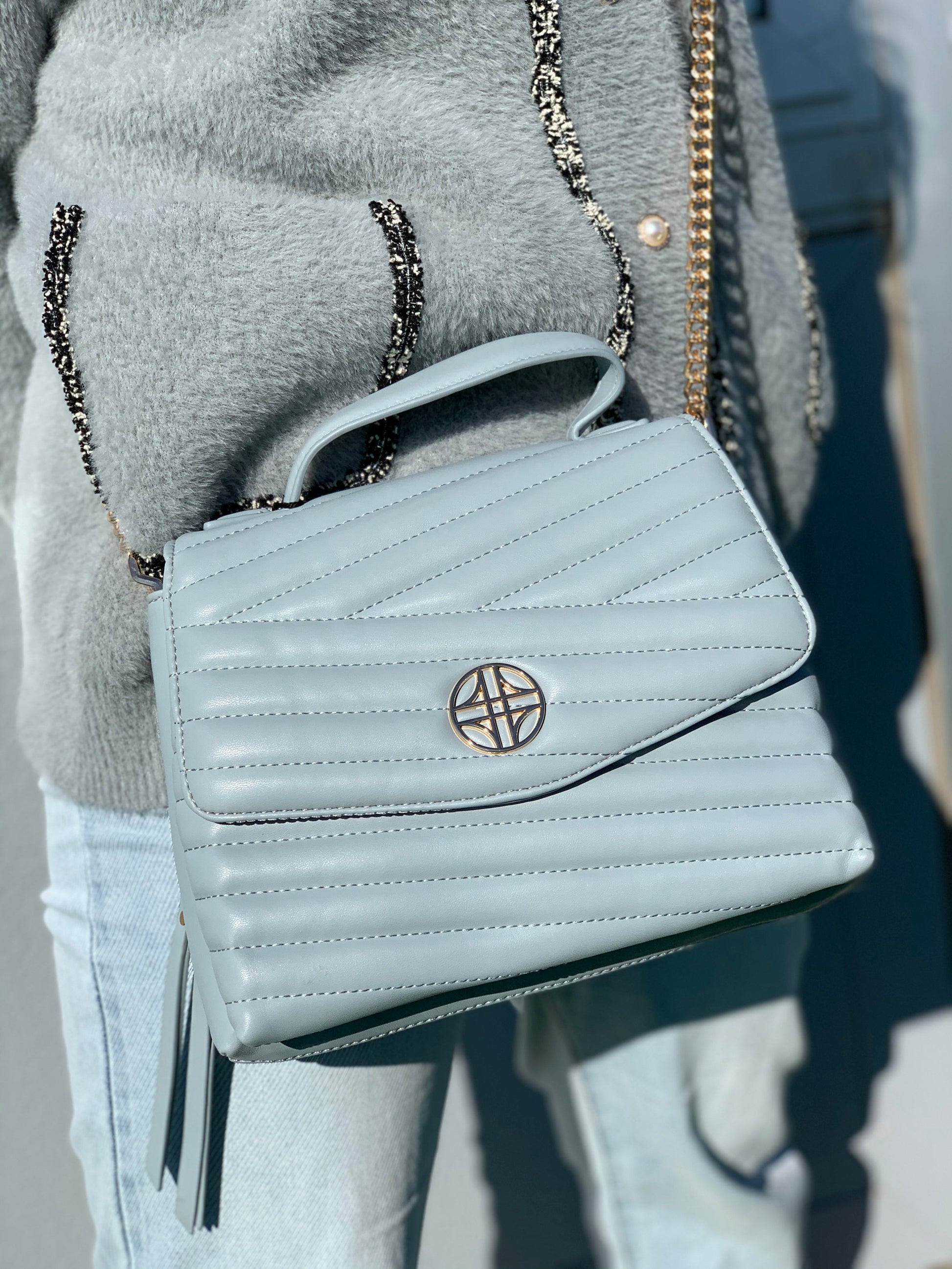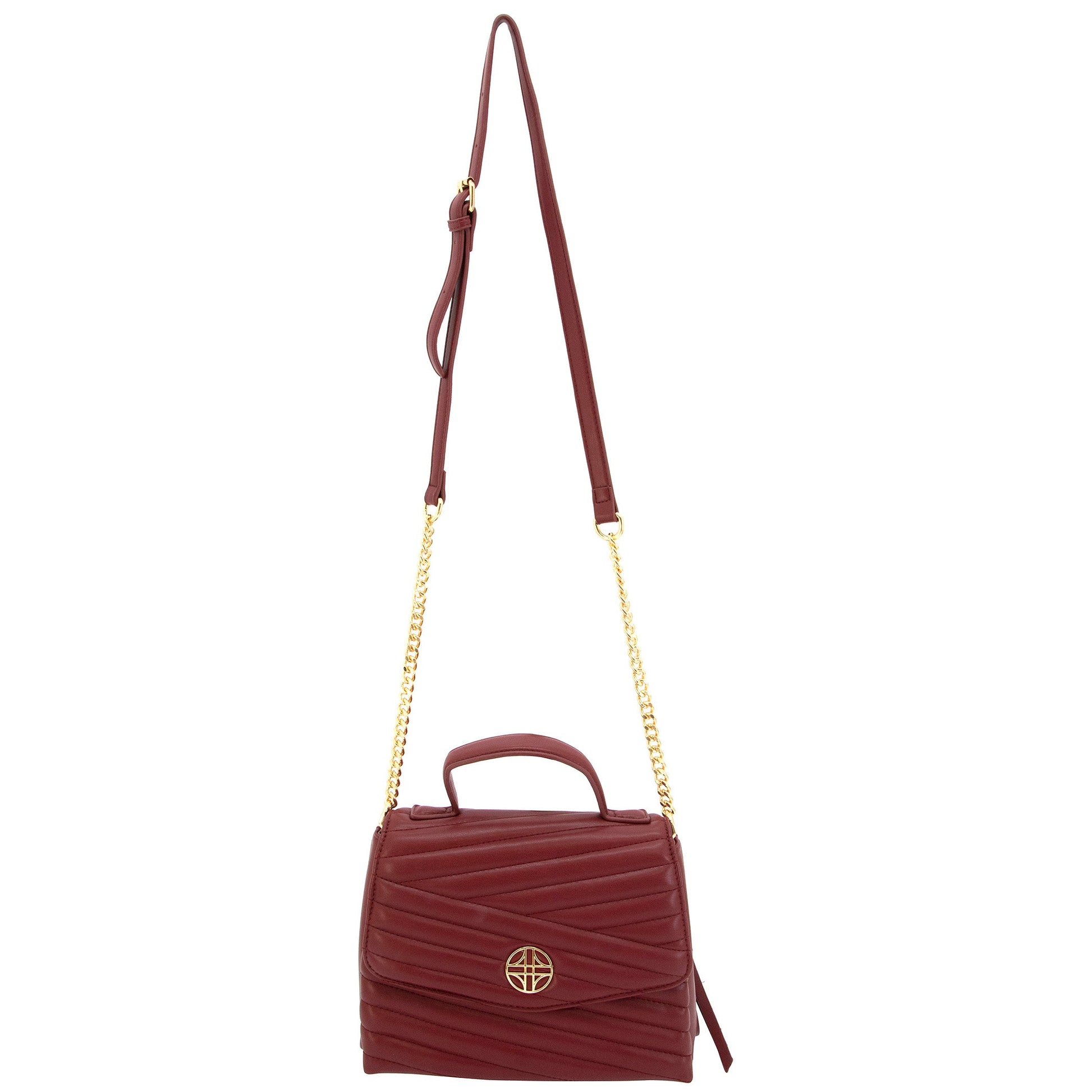 Venus is vegan leather, quilted handbag with a half flap front, hidden magnetic snap closure, and delicate gold medallion detail. It features both a vegan leather handled, a curb chain strap, and a structured top handle.