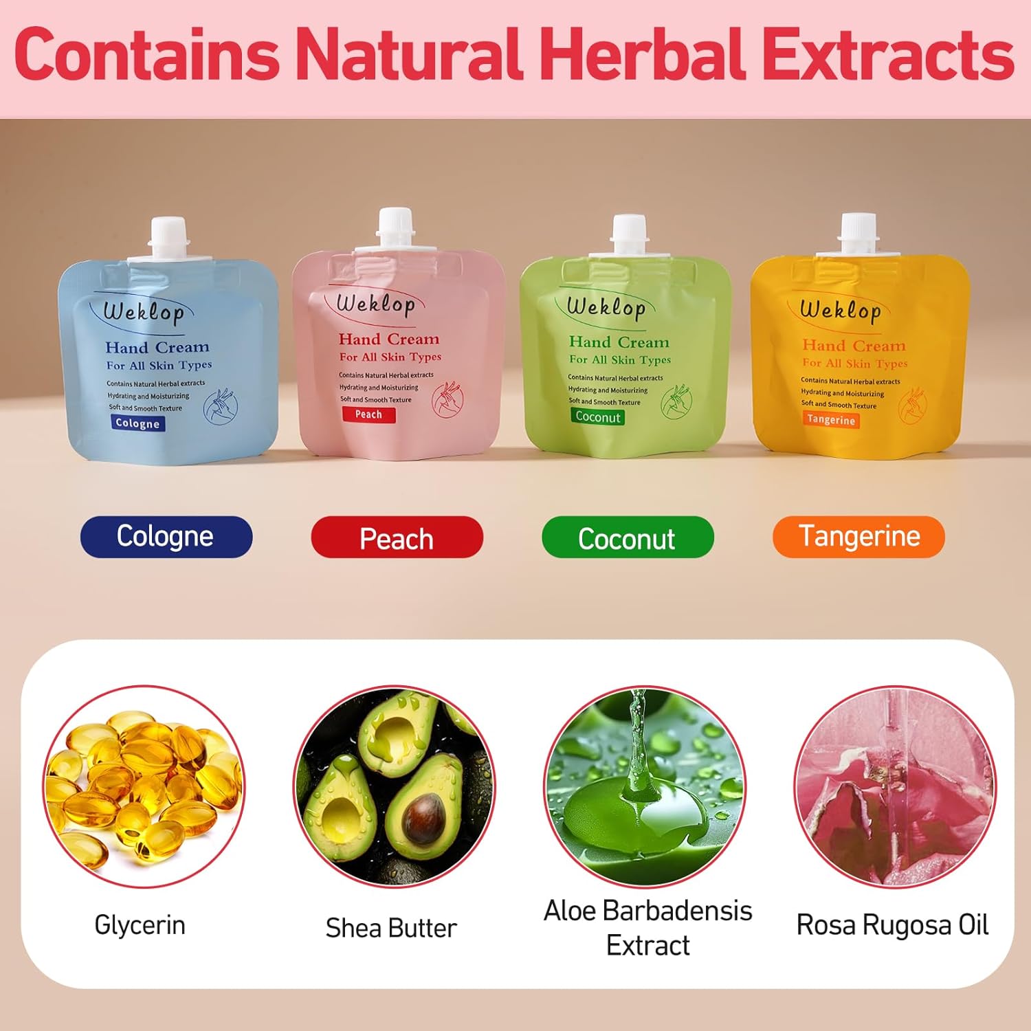 Pamper your hands anytime, anywhere with the WEKLOP Natural Moisturizing Travel Size Hand Cream four-piece set. This cute and dainty set features three fruity scents, Peach, Tangerine, Coconut, and a special Cologne scent, perfect for matching your perfume on special occasions. The fresh and sweet fragrances of the fruit creams make everyday hand care a delightful ritual.